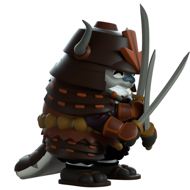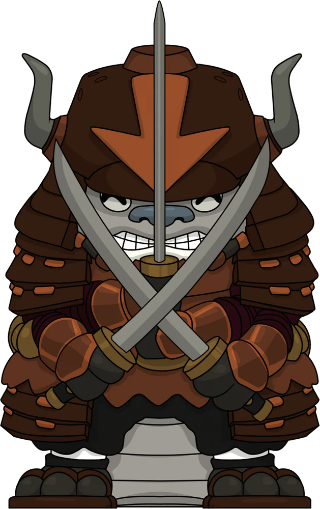 Appa returns and means business! Standing at 4.1 inches, Appa is ready to fight and, undoubtedly, win. He wears a serious expression on his face, with a grimace on his face that bares all of his teeth out. He is dressed in a traditional samurai uniform in a red colorway, and is using all 4 of his hands to wield 3 different weapons for battle. The exterior of his double-walled packaging takes place in a beautifully illustrated forest with greenery surrounding the area. The protective sleeve is a drawing of all 4 elements. This collectible ships in a matte, embossed, protective outer sleeve and a custom sized plastic protector for maximum protection during shipping.