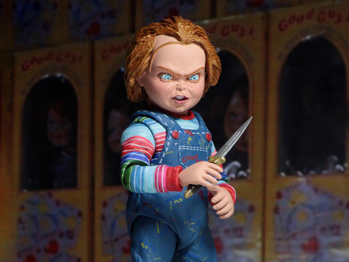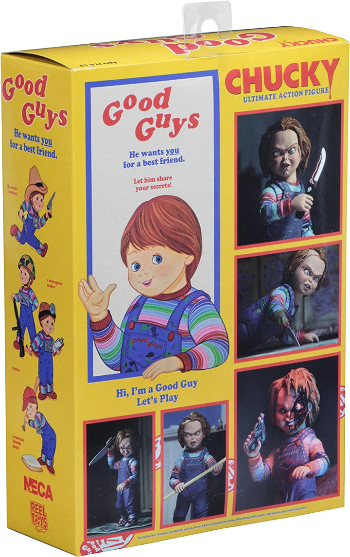 This Ultimate Chucky figure comes with a whopping four interchangeable head sculpts, and is packed with terrifying accessories: baseball bat, hammer, voodoo knife, hunting knife, butcher knife, straight razor, yardstick, pistol, interchangeable right forearm with blade, interchangeable hands, and more.