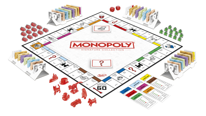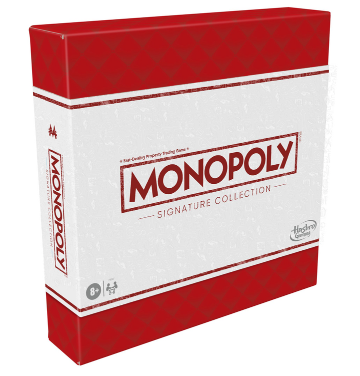 Chase your fortune with this ready-to-display Monopoly Signature Collection board game! Roll the red dice to purchase properties, and raise rent with luxe Houses and Hotels. Players can arrange the foil-treated money in their own personal tray and move around the board with one of 8 red enamel Monopoly tokens. Chance and Community Chest cards may lead players down the path to bankruptcy so don't get too comfortable! Accumulate wealth, test friendships, and create lifelong memories for generations to come. With classic Monopoly gameplay in a premium package, this collector's edition of the Monopoly game makes a perfect gift for Monopoly fans ages 8 and up. The Hasbro Gaming and Monopoly names and logos, the distinctive design of the gameboard, the four corner squares, the Mr. Monopoly name and character, as well as each of the distinctive elements of the board and playing pieces are trademarks of Hasbro.