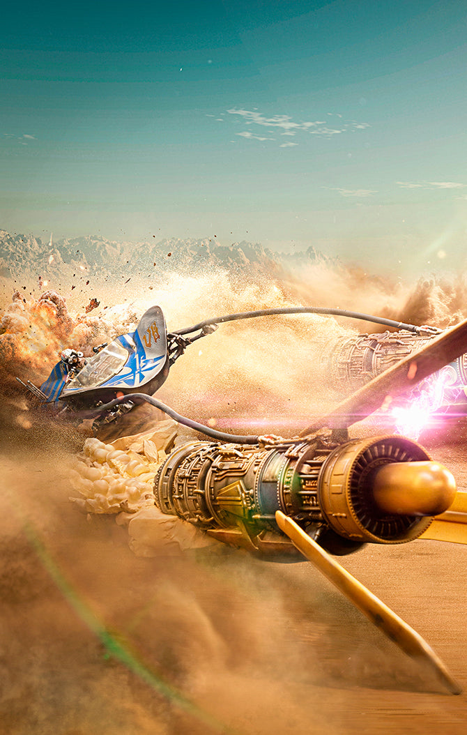 Over the scorching sands from the desolate and desertic planet Tatooine, among gorges, mountains, caves, and treacherous rocky formations, a dangerous and mortal race competition takes place. Moving in high speed with perilous maneuvers, one-man repulsorcrafts known simply as Podracers compete among themselves, like sleds propelled by big turbine engines. Believing to be the only human being capable of competing, in a scenario in which this sport is usually practiced by aliens from various worlds, an enslaved boy from the Mos Espa market, joins a Jedi master in a bet in which the prize is his freedom. Over a diorama base replicating part of the race’s track, with one of the propeller turbines raising clouds of sand next to the ground, displaying a dynamic scene with the vehicle inclined as if it's turning a curve, Iron Studios present the statue "Anakin's Podracer - Star Wars - Demi Art Scale 1/20", with the young Skywalker in his vehicle built by his own hands, in the emblematic scene where he fights for his freedom in Star Wars Episode I: The Phantom Menace (1999) which celebrates its 25th Anniversary, commemorated by Iron Studios with this release!
