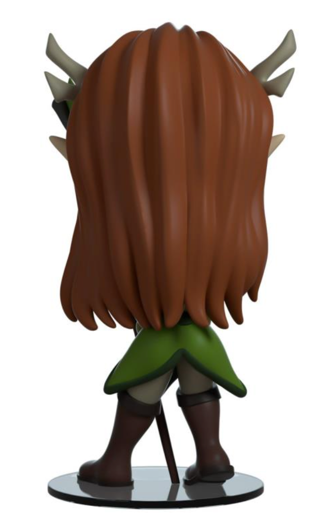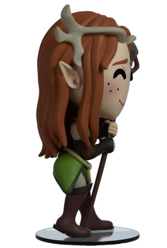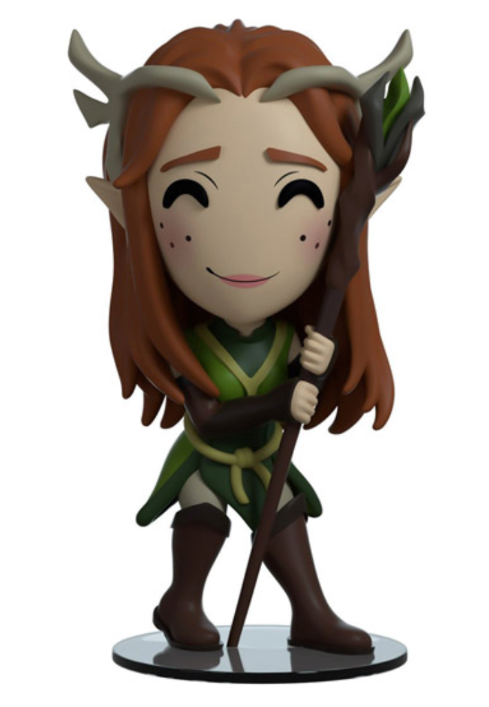 OK!..... I'll regenerate your arm, I'll bring that back, I guess! The headmaster of the Air Ashari has become her very own Youtooz. Standing at 5 inches tall Keyleth has never looked cuter. She has been modelled in her classic elven costume. While she stands clutching her staff, the Spire of Conflux, with both hands. Her ears poke out from under her red hair and beneath her antlers. Her face is shown with a smirk, under flushed pink cheeks. The windowed display box has been illustrated to show Keyleth seated in a dark lush elven forest. Surrounded by colourful foliage of different types. The interior of the box has been illustrated with the Vox Machina logo over the top of a view of the continent as strings of golden light dance across. Illustrated on the protective sleeve shows silhouettes of all the campaign members in front of a golden sunset. This collectible ships in a matte, embossed, protective outer sleeve and a custom-sized plastic protector for maximum protection during shipping.