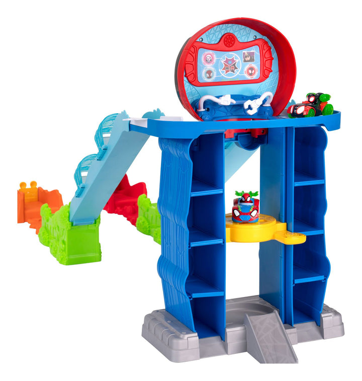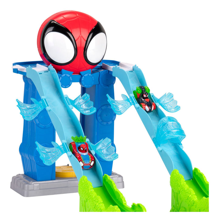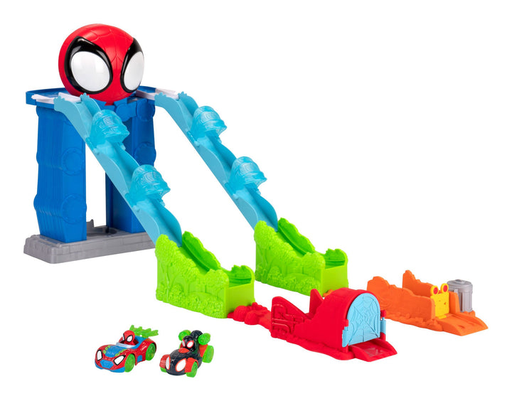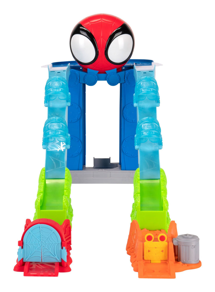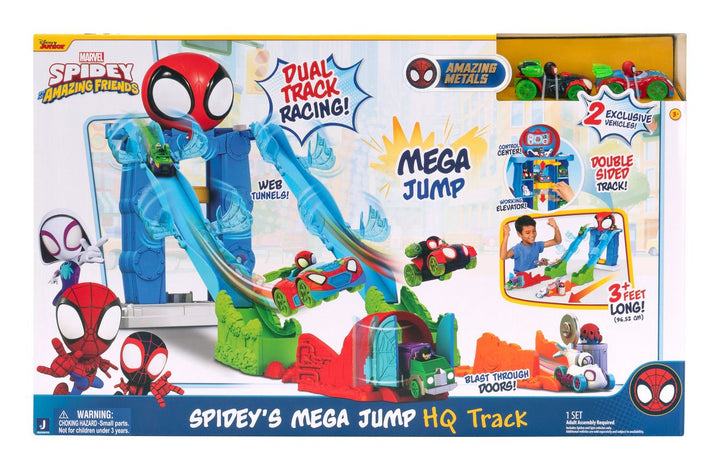 Leap into adventure with the MARVEL Spidey and His Amazing Friends Spidey’s Mega Jump HQ Track. This deluxe 39-inch dual race track showcases the Spidey team’s Web-Quarters, featuring an elevator, control centre, web tunnels and two unique exit ramps. The set also includes two exclusive Amazing Metals vehicles of Spidey’s Web Crawler and Spin’s Techno Racer. First, push the vehicle onto the elevator disc and lift the handle to raise it into the control centre. Then, use the fuel pump and brushing tool to prep the vehicle for action. Launch the vehicles down the ramp where they will burst through web tunnels, soar over a mega jump, and blast through the exit tunnel or gate. This double sided track has ten parking spots for extra vehicle storAge . The Spidey’s Mega Jump HQ Track is inspired by the hit show Spidey and His Amazing Friends. Officially licensed MARVEL product from Jazwares. Age s 3+