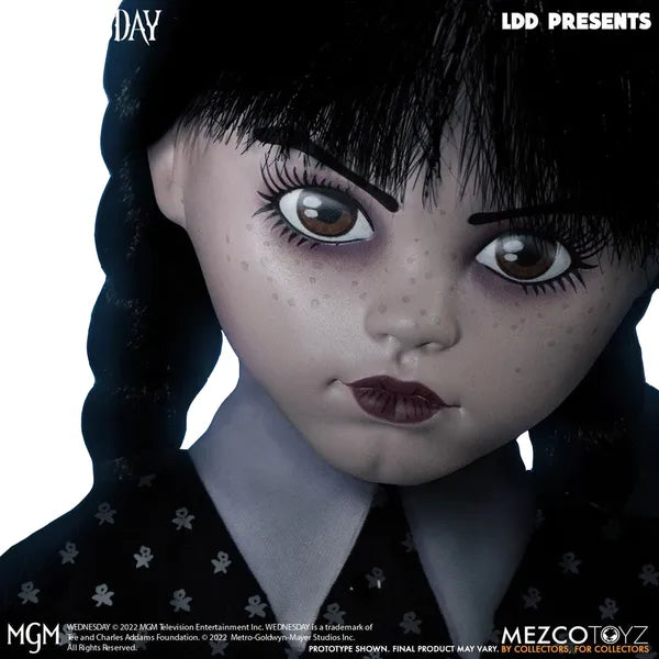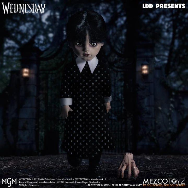 Wednesday features an all-new look that is still somehow familiar, outfitted in a collared dress, black leggings, and boots. She comes complete with a new painted portrait, signature pigtails, and her trusty hand-servant, Thing, in a static pose. LDD Presents Wednesday stands 10 inches tall and features 5 points of articulation. She is packaged in a window box and perfect for anyone looking to add to their display.