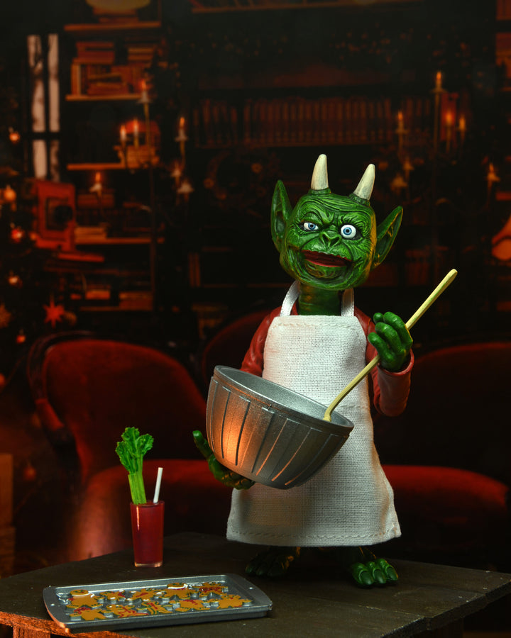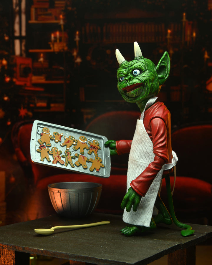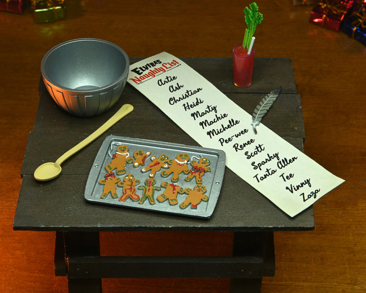 The devilishly delightful Cassandra Peterson has played the part of Elvira for more than 40 years with grace, humor and more than a little camp. NECA is proud to present this hauntingly holiday themed figure for your horror collection. This Deluxe Scary Xmas Elvira 8" action figure is fully articulated and features tailored fabric clothing, two interchangeable expressions, Bloody Mary, naughty list with quill, tray of gingerdead men cookies, and an articulated 'Creature Who Was Stirring' figure with tailored fabric apron, bowl, and spoon. Comes in window box packaging with slipcover.