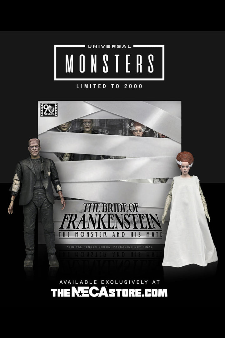"We belong dead..." Celebrate 90 years of classic horror and doomed romance with this haunting tribute to the classic Universal Monsters film, The Bride of Frankenstein! NECA proudly presents The Monster and His Bride, a commemorative action figure 2-pack that brings Frankenstein’s Monster and his Bride together in one electrifying collector’s set.