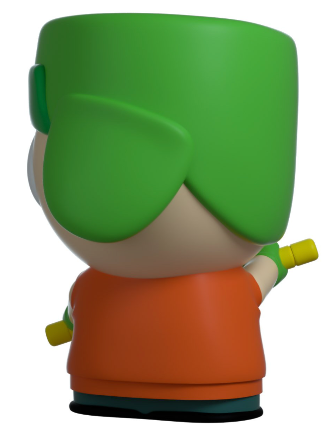 Kyle makes his Youtooz debut as his ninja persona Bunraku, a deadly but compassionate ninja who protects those in trouble. At 3.4 inches tall he stares forward and grips a pair of nunchaku across his front, its chain held taught and ready for an onslaught. He wears a warm green flapped hat and matching gloves, his bright orange shirt is sleeveless orange for optimum mobility of course. The exterior of his packaging shows the glass cases of the weapon ‘shop’ where the boys procured their arms. While the interior is a simple greyscale repeating pattern of the South Park Logo The protective sleeve shows the four boys' faces peeking from the corners of the packaging over a rich black background. This collectible ships in a matte, embossed, protective outer sleeve and a custom sized plastic protector for maximum protection during shipping.