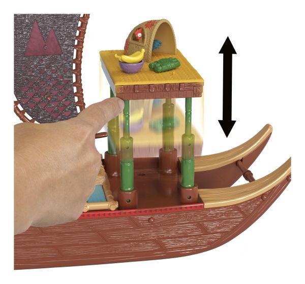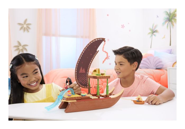 Moana's Adventure Canoe playset, inspired by Disney's Moana 2, the theatrical sequel to the original film, is ready to explore the sea and set sail beyond Motunui! With six transforming play areas a foldable water slide, hidden kitchen and hammock, platform, animal hut and animal boat the opportunities for storytelling play are endless. Moana small doll and her friend, Heihei the chicken, come together on the almost 2-foot-long floating canoe for fun on land, sea or bath tub! Long travels work up an appetite, so coconuts, oranges and bananas are included with other dining accessories for a tasty snack. Dolls cannot stand alone. Colors and decorations may vary.