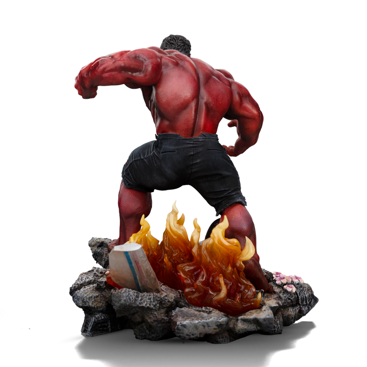 The statue captures the aftermath of his transformation, with the tattered remains of black pants clinging to his muscular frame. Every detail, from the veins bulging on his arms to the texture of his torn clothing, is meticulously sculpted and hand-painted to bring Red Hulk to life.
