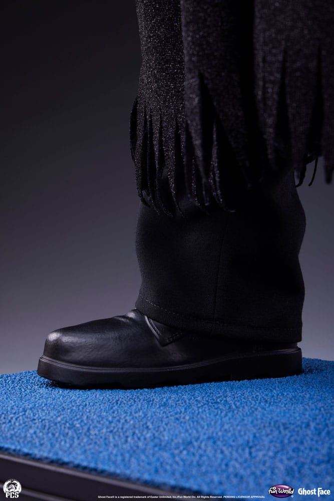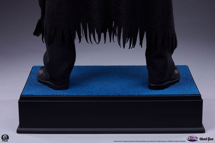 Standing over 38" tall, this mixed media collectible strikes a menacing pose, standing confidently as the masked killer wipes the blood from the blade of their terrifying knife. The ghostly white mask contrasts starkly against the killers jet black cloak and hood adding additional drama to the masks already haunting appearance. This half scale statue includes a tailor made fabric cloak with screen accurate shimmer effect as well as real fabric trousers for an even greater sense of realism.