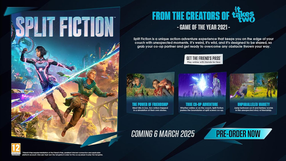 Embrace mind-blowing moments as you’re pulled deep into the many worlds of Split Fiction, a boundary-pushing co-op action adventure from the studio behind 2021 Game of the Year Winner It Takes Two. Mio and Zoe are contrasting writers – one writes sci-fi and the other writes fantasy – who become trapped in their own stories after being hooked up to a machine designed to steal their creative ideas. They’ll have to rely on each other to break free with their memories in-tact, working together to master a variety of abilities and overcome diverse challenges while jumping between sci-fi and fantasy worlds in this unexpected tale of friendship.