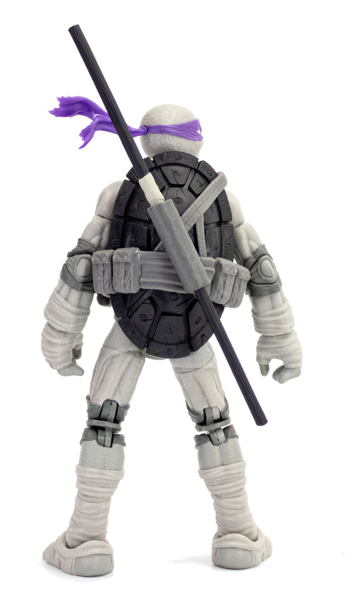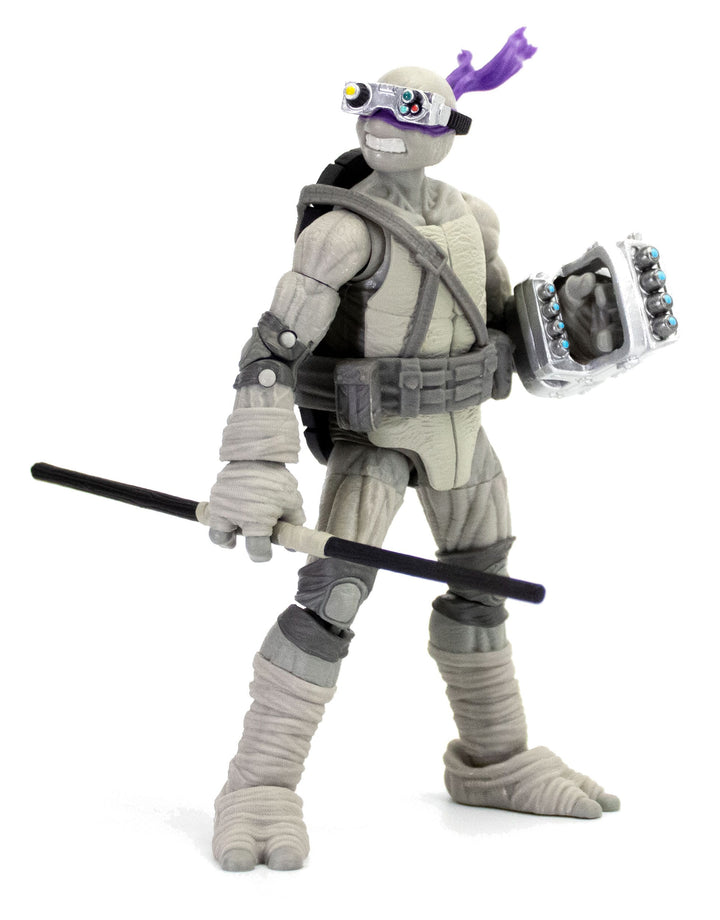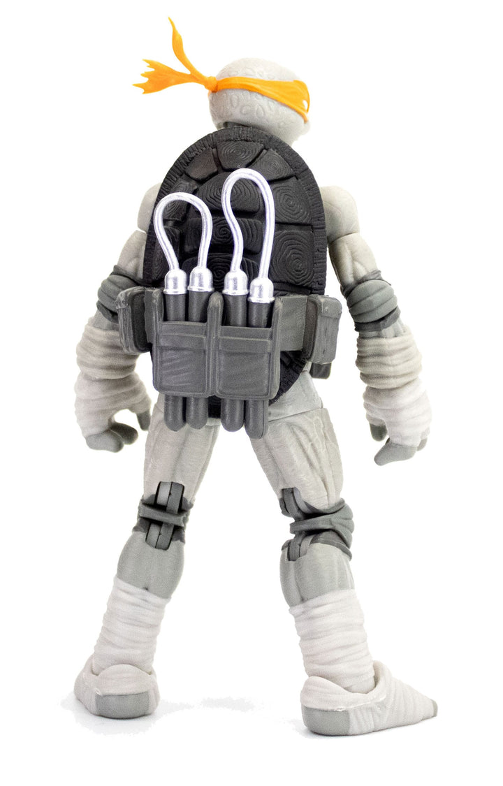 nspired by artist Mateus Santolouco, and the IDW TMNT character designs, The Loyal Subjects leaves no holds barred, releasing a TMNT Heroes 4 pack in the coveted comic book monochromatic color scheme with colored bandana masks! Includes – Michelangelo, Leonardo, Donatello, and Raphael with their signature weapons, multiple hand grips, 31 pts of articulation (per figure), customized artwork provided by Mateus Santolouco, a garage door style collector’s box with Velcro cinches, a detailed insert/backing card, and the BST AXN scale – figures ranging from 5” +. Each figure boasts killer sculpt details, a mind-blowing range of motion, utility belts and bandoliers to hold weapons when not in use, killer paint details, and the packaging is…*MUWAH*, a work of art! A must-have signature piece for any collector’s shelf.