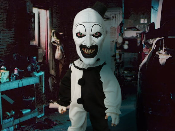 Art features an all-new head sculpt depicting a sinister, spine-chilling, toothy grin. He’s outfitted in his signature black and white clown suit with pom-pom detailing on the front, and ruffles around his wrists and neck. Press the button discreetly hidden on Art’s back to hear some hair-raising sounds! The diabolical clown comes equipped with his weapon of choice, a bloody hacksaw that fits neatly in his right hand.