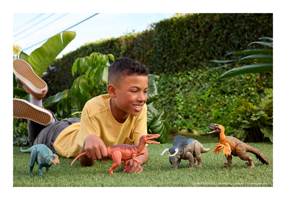 • Attack and roar! This Wild Roar Abelisaurus toy inspired by Jurassic World Rebirth has an aggressive chomp attack which can change direction, and a ferocious roar for dinosaur battle play!