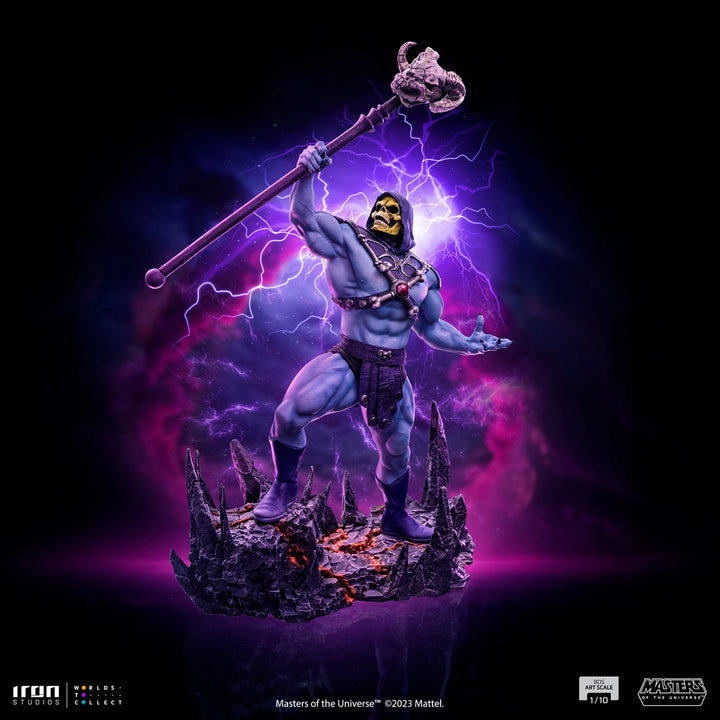 Over a base in which pointy rocks emerge from the ground just like serpent fangs, and crevices on the floor draw an intrinsic and complex vascular system of incandescent lava, Iron Studios proudly present their Skeletor Battle Diorama Series statue, with He-Man’s biggest archenemy in a new version for the MOTU collection of statues, fulfilling the wish of fans and collectors.