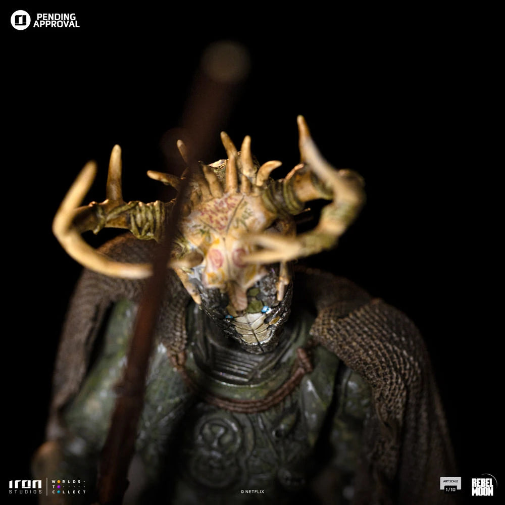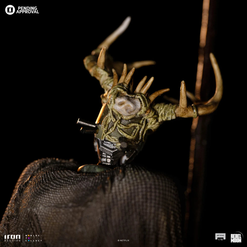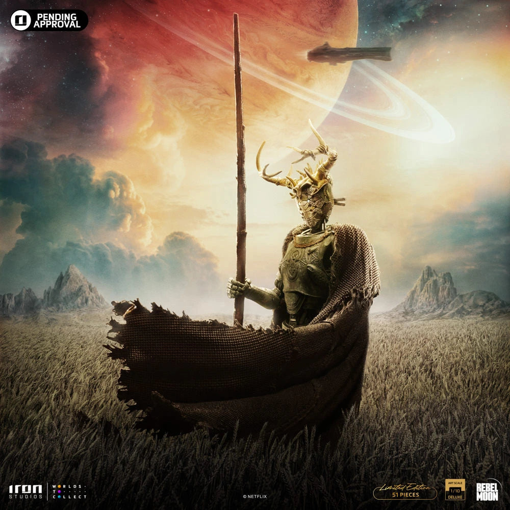 Created in the past to defend the king from a galactic empire, the slim metallic figure using the antlers of a hart as a crown, observes while leaning on his staff in the wheat fields from the farming colony Veldt, a settlement known mainly for its agriculture. With the body worn-out by the action of time, covered by an old shabby fabric cape, after centuries he was repurposed by the Imperium, a big army of soldiers that work under the command of the regent Balisarius, for hard labor in the field. However, when the Imperium demands Veldt’s resources to feed themselves, the peaceful agricultural colony starts a conflict with Balisarius’ forces, and Sam, a country girl that creates friendship bonds with the robot, awakes something in his mechanical mind that changes his vision about his own existence. Revealed firsthand at SDCC 2023, Iron Studios present the statue "Jimmy - Rebel Moon - Art Scale 1/10", in the regular version of the droid JC-1435, simply known as Jimmy.