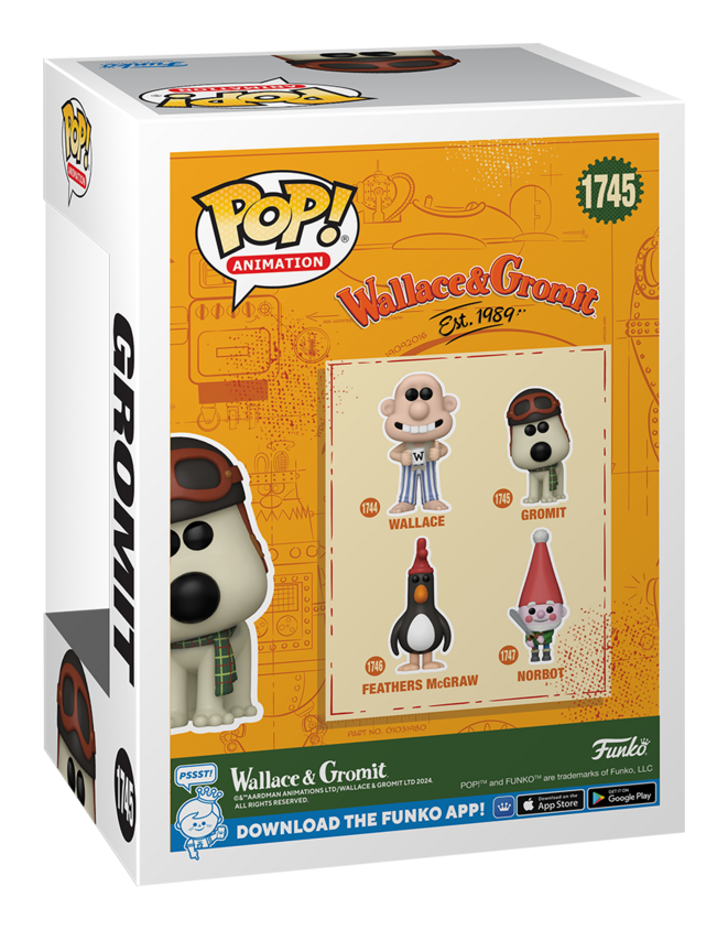 Ready for takeoff! Pop! Gromit is here to take your Pop! Animation collection to new heights! Grab your aviator hat and welcome this stop-motion icon to your Wallace & Gromit™ lineup. Vinyl figure is approximately 3.55-inches tall.