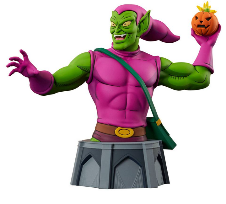 The Green Goblin is on the hunt, and he's got a pumpkin bomb with your name on it! This 1/7 scale mini-bust of Norman Osborne's alter ego is based on the villain's appearance in Spider-Man: The Animated Series. It stands approximately 6 inches tall and features detailed sculpting and animated-style paint applications. Limited to only 3000 pieces, it comes packaged with a numbered certificate of authenticity in a full-color window box. Make sure to add this Green Goblin bust to your collection!
