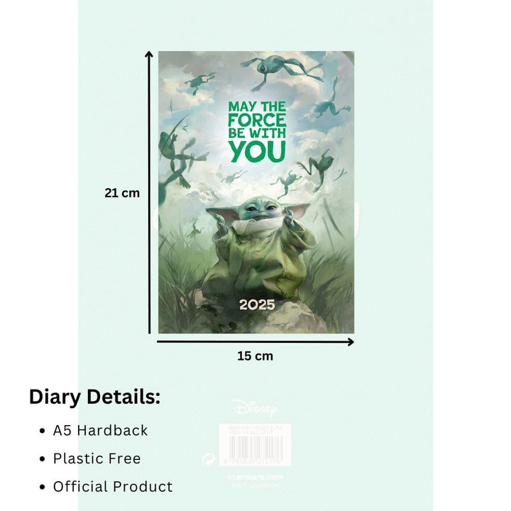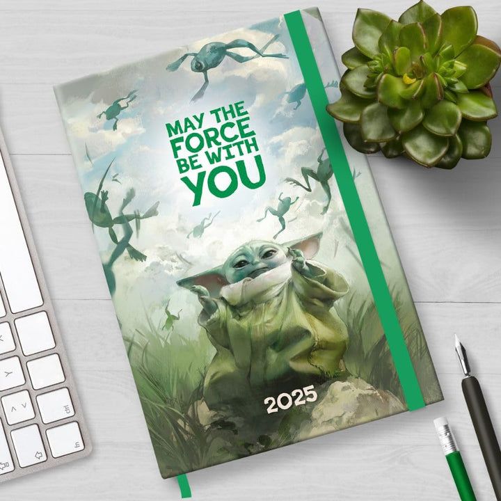 Green diary featuring Grogu on the front wth the classic phrase 'May the Force be with You' on the front