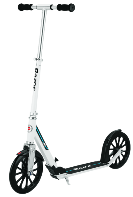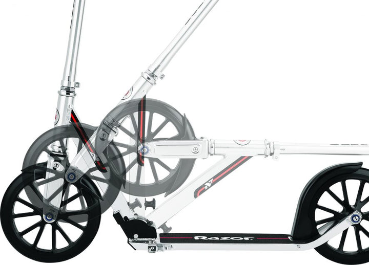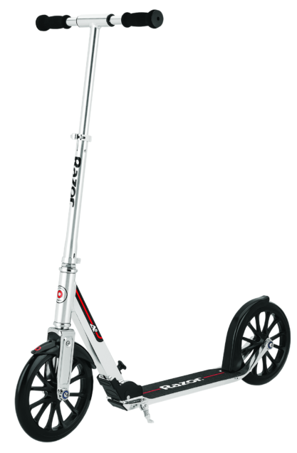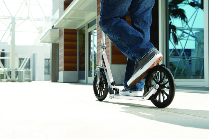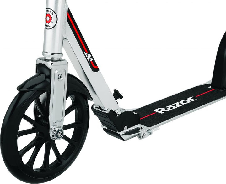 The Razor A6 Scooter Silver is engineered for riders who demand comfort and speed in the urban environment. Its extra-tall, adjustable handlebars reach up to 42 inches, eliminating the need to hunch and promoting a natural, upright riding posture. The extra-long deck provides ample space for your feet, ensuring a comfortable ride without scrunching. Built with a sturdy aluminum frame and equipped with large 10-inch spoked urethane wheels featuring double bearings, the A6 delivers longer glides and greater speed with every kick.