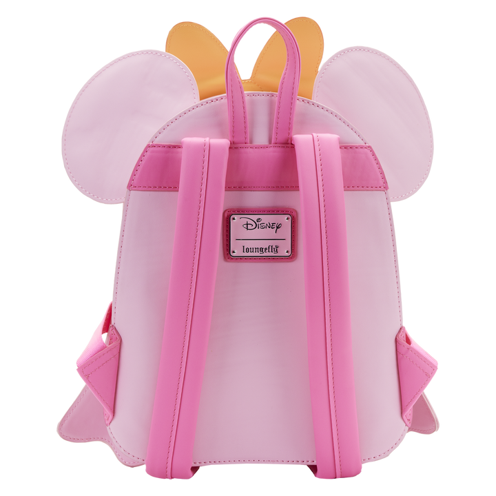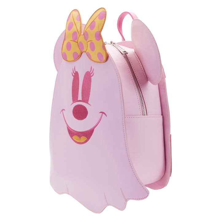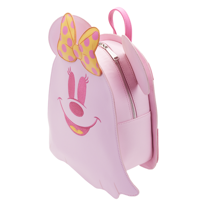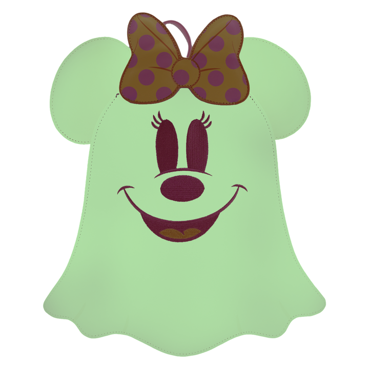 Boo-tiful adventures await with this Loungefly Disney Pastel Ghost Minnie Mouse Glow-in-the-Dark Mini Backpack. Pack just what you need for any spirited trip. On the front of this figural backpack, applique details bring Minnie Mouse, as a pink ghost, to life. Her otherworldly ears stick up over the top of the backpack, and an orange bow, sprinkled with pink polka dots, adds a terrific twist to Minnie Mouse’s classic look. Turn out the lights, and Ghost Minnie Mouse glows in a glorious green colour. It’s the perfect accessory for a ghost tour—or for visiting any of your daily haunts.