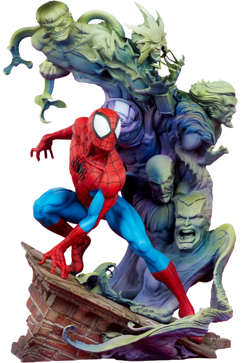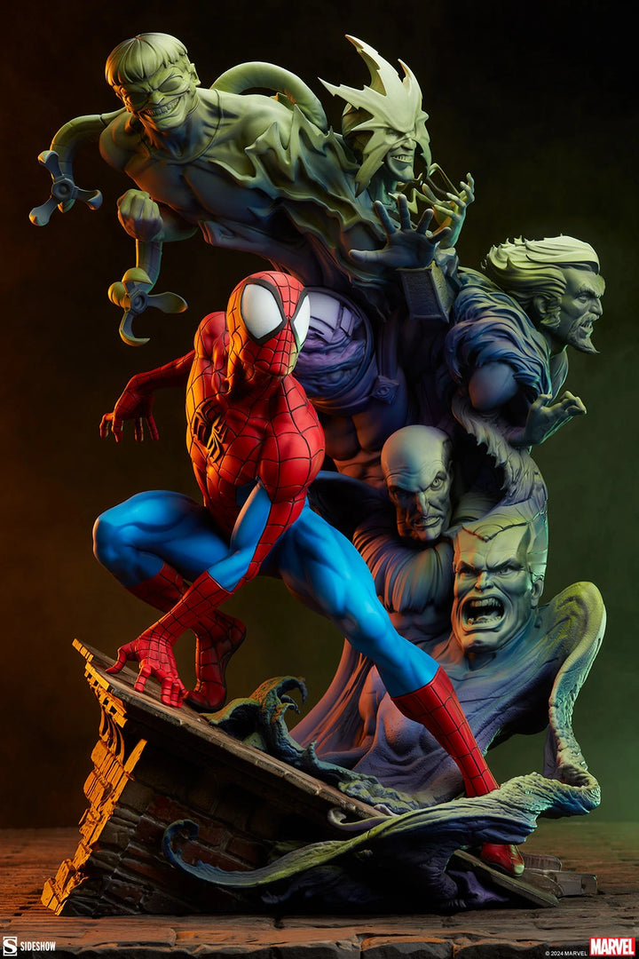 This highly detailed, fully sculpted Spider-Man Premium Format Figure gives fans a three-dimensional perspective at Peters Spider-Sense in action. Spider-Man wears his classic red and blue comic costume, with his big white bug-eyes bulging when he discovers that his enemies are nearby. The Sinister Six swarm behind Spider-Man in muted green, yellow, and purple tones. They rise up from the figures base in a gravity-defying, jaw-dropping display of Spider-Man's sensational situational awareness.