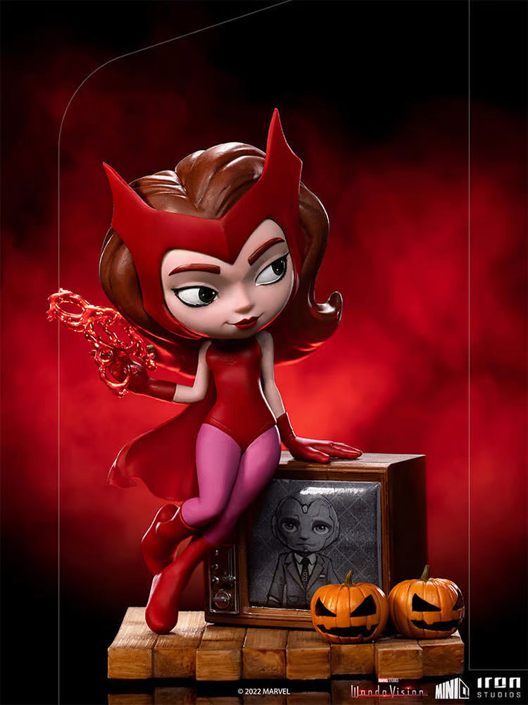Playing with her mystic powers, the beautiful witch with auburn hair leans on an antique TV set, making the image of her beloved husband appear on the screen, the synthezoid Vision, just like in an old black and white series. Wearing a leotard with boots, gloves and a red cape, besides her classic tiara, the Avenger Wanda Maximoff comes up with her look from the Marvel comics, ready to celebrate Halloween like a "Sokovian Fortune Teller", with small pumpkins decorated for the occasion in its pedestal. Iron Studios present their statue "Wanda Halloween Version – Wandavision – MiniCo" with the powerful Scarlet Witch in the stylized MiniCo format, inspired by "All-New Halloween Spooktacular!", the sixth episode from Marvel’s miniseries "Wandavision" from streaming channel Disney+.