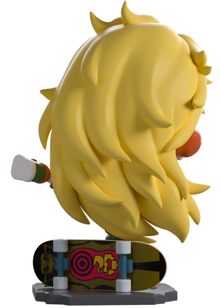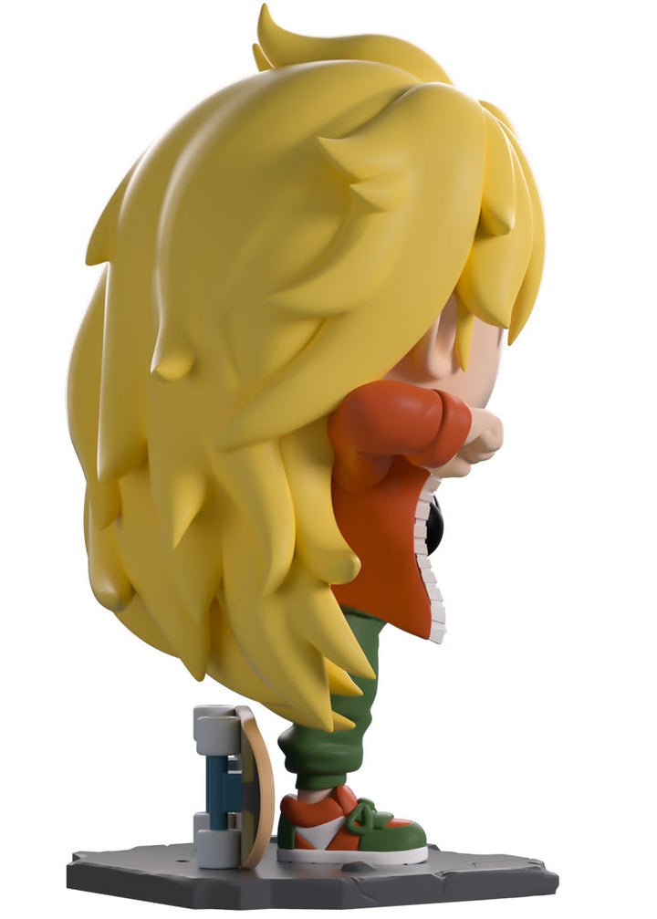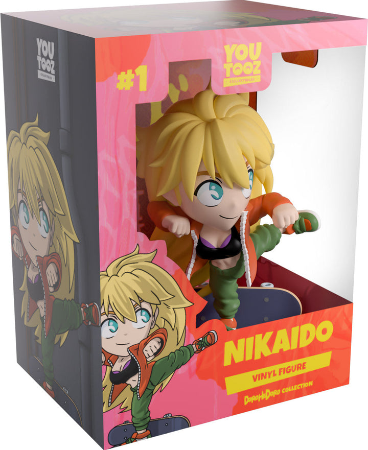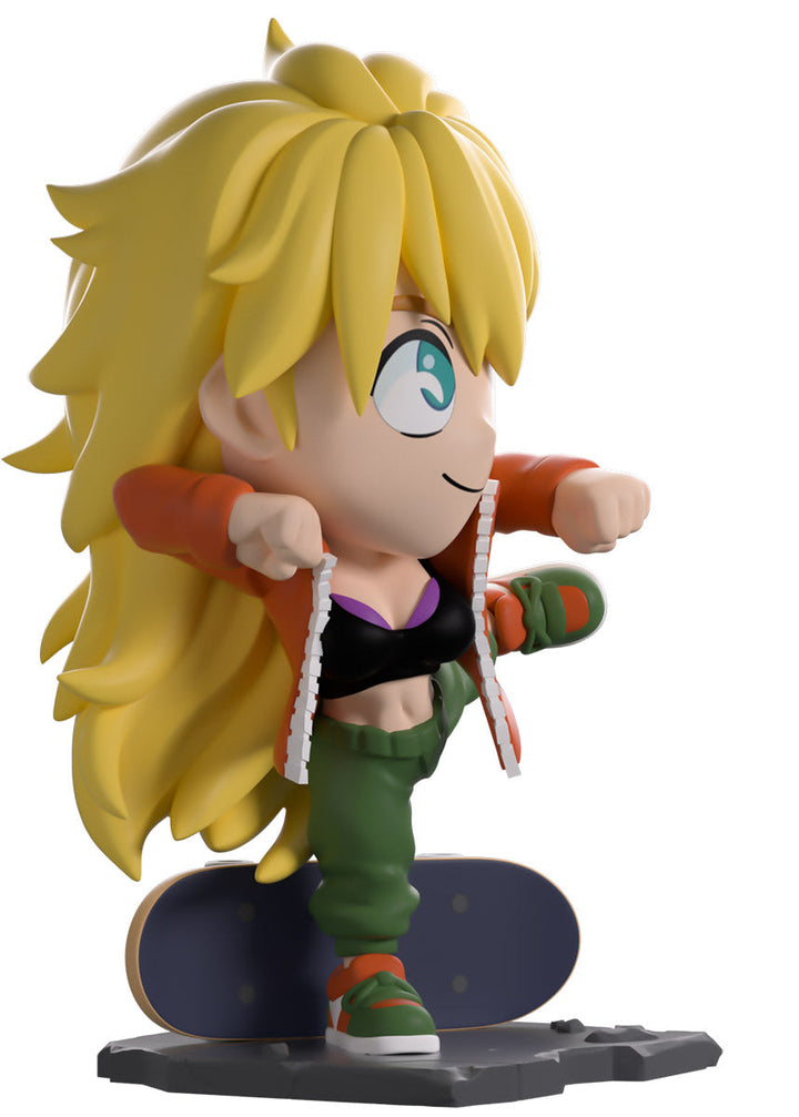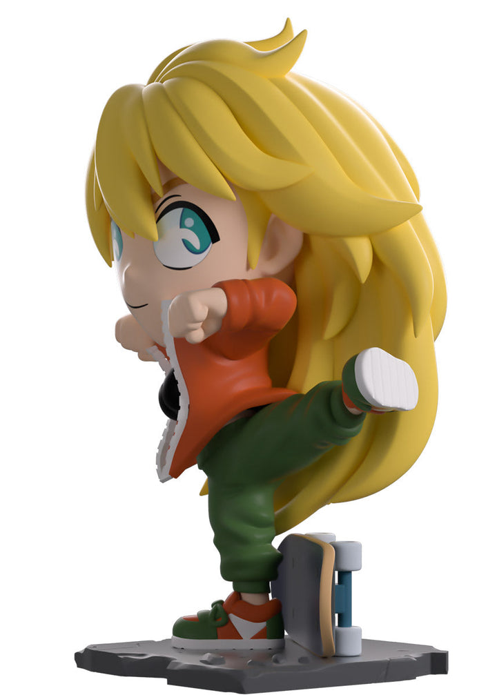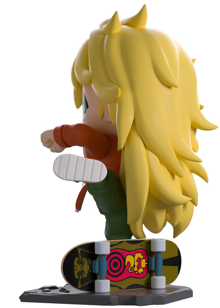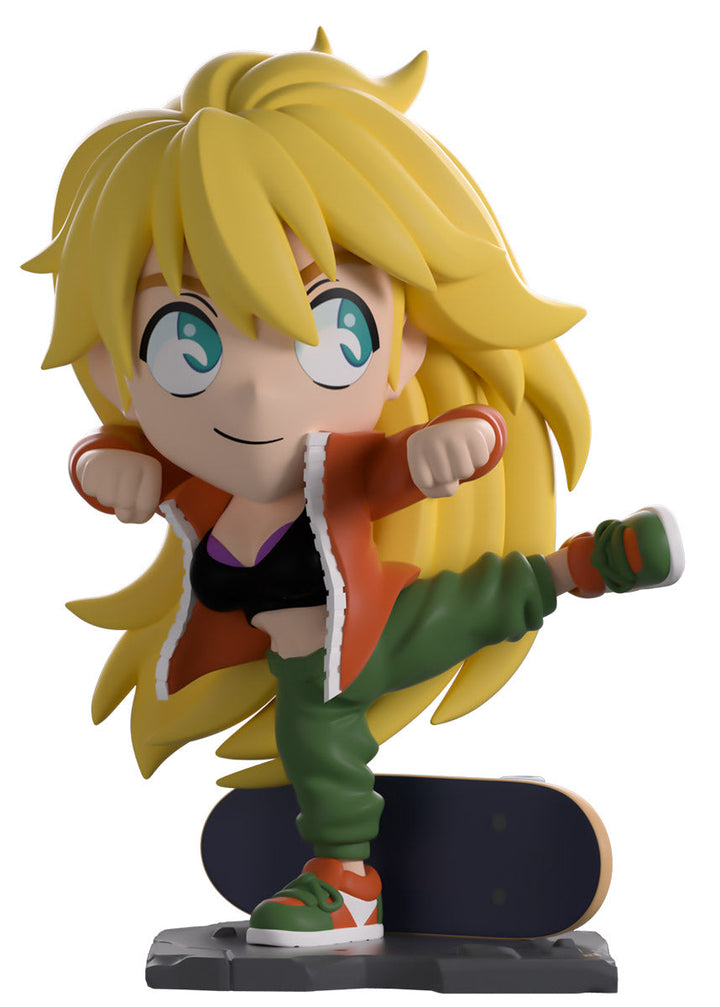 Showing off her insane fighting skills to unleash a ferocious kick and stand at 4.7 inches tall on one leg with her elbows raised, an assured smile crosses her face underneath bright blue eyes as her long mane of blonde hair sweeps down her back. She may be dressed casually, but she’s always deadly! She is wearing a large orange jacket open over a black sports bra, loose green pants, and stylish orange and green kicks as her trusty skateboard sits behind her, ready for whenever she needs it! The exterior of her packaging sees Nikkaido standing in a dirty alley in front of her diner, while the interior is a series of pink tones which make up a town silhouette above rocky water as light smoke clouds rise up and the ‘Dorohedoro’ logo is printed in a bright red. This then continues onto the protective sleeve where his figure can be seen through the large clear window at the packaging’s front. This collectible ships in a matte, embossed, protective outer sleeve and a custom-sized plastic protector for maximum protection during shipping.