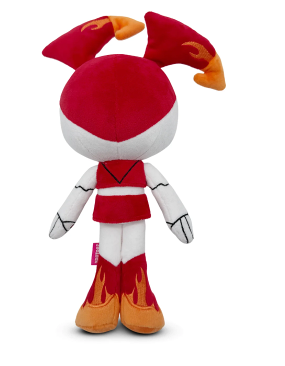 Jenny's back again and ready to strut her stuff in her hot rod form! Standing tall at 9 inches tall with a serious face and two pointed ponytails sticking out from the top of her head, her normal teal outfit has been replaced with a bright red that has tendrils of orange flames dancing up her boots and from the tips of her hair. This plush is packed to the seams with 100% PP cotton and is made of the softest minky material with accents of felt, perfect for cuddling or looking hot with!