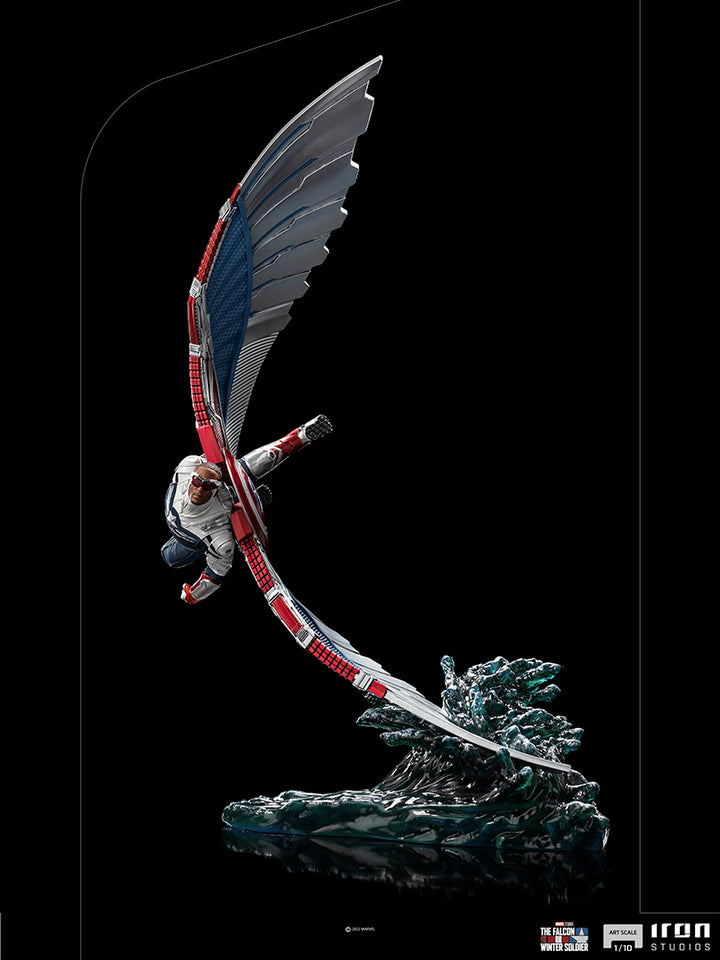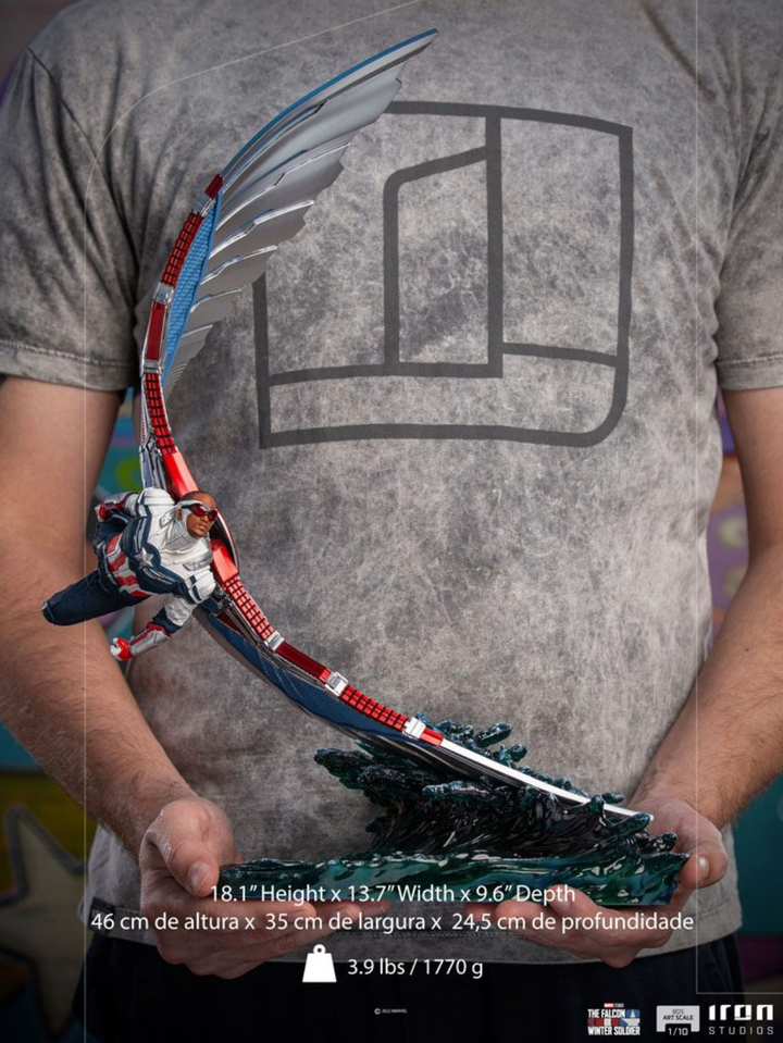 On a base that resembles the Hudson River, cutting through the waters with one of its mighty mechanical wings, the new winged Sentinel of Liberty uses all of its enhanced maneuverability and agility skills, as an actual bird of prey, with its new outfit with stars and stripes in the colors of his country's flag, carrying on his back the legendary shield of his predecessor. He flies at high speeds over New York City on a mission to rescue the victims of the terrorist and anti-nationalist group known as Flag Smashers. Inspired by the "One World, One People", the sixth and final episode of the first season of the miniseries "The Falcon and the Winter Soldier" on the Disney+ streaming channel, Iron Studios presents the statue "Captain America Sam Wilson Deluxe - The Falcon and the Winter Soldier - BDS Art Scale 1/10", with the hero, formerly called Falcon, taking on the name and legacy of the first avenger.