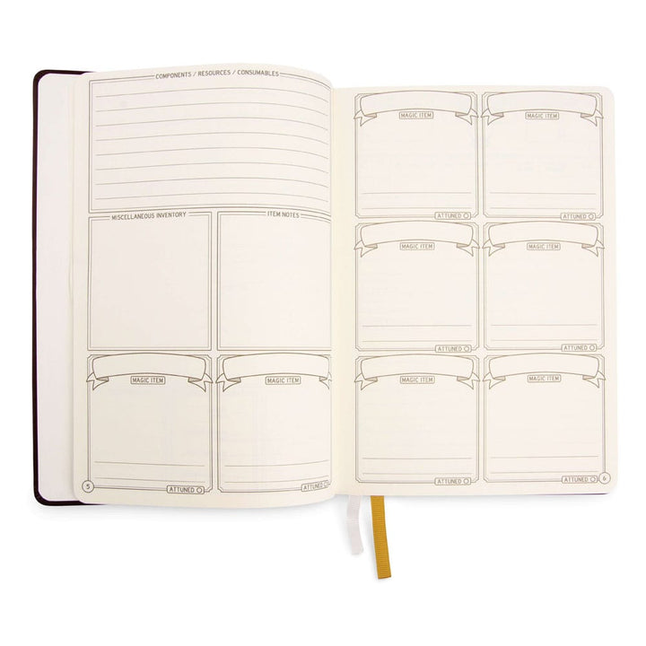This notebook has everything you need and more. You'll find all kinds of different places to keep track of important things that you've never seen on any other dnd Character Sheet, like customizable character resources, coinage, magic item attunement trackers, session logs and much much more. Track everything neatly Next to all the standard stuff you expect from a Character Sheet this notebook also offers the ability to track Spells, spell slots, coinage, loot, customizable character resources, locations, components, magice potions and way more! Two Campaigns! Worried about your dnd character dying? Or do you just play more than one dnd campaign at the same time? No worries, we got you. This notebook features two full character sheets and has two differently colored bookmarks to keep track of both! Document Pouch Don't lose those loose sheets of paper we all tend to have sometimes, just stick them in the document pouch in the back!