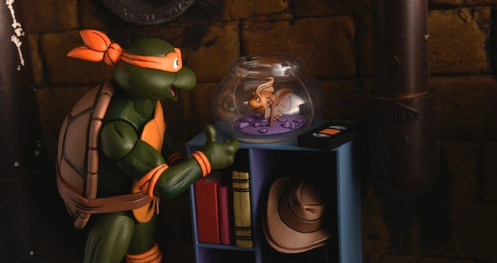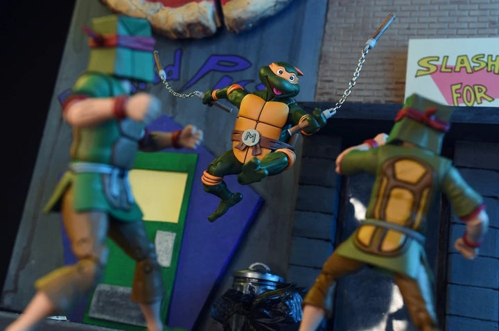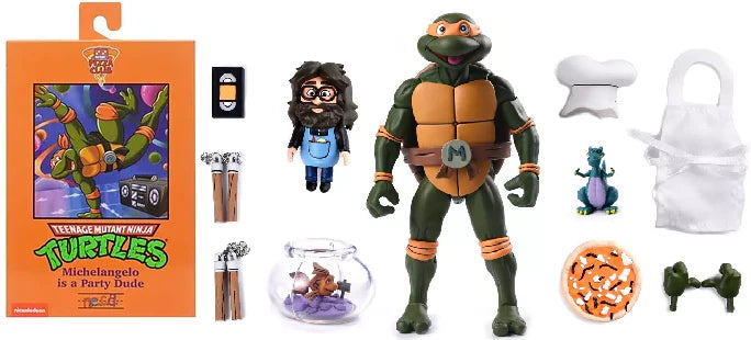 Based on the classic 1980s Teenage Mutant Ninja Turtles cartoon series! The party dude Michelangelo is getting the “Ultimate” treatment with this 7-inch scale action figure loaded with accessories. His included chef's hat and soft goods pizza apron pair perfectly with his granola & licorice pizza and other episode-specific accessories! Comes in all-new Pizza Club VHS style collectible packaging.