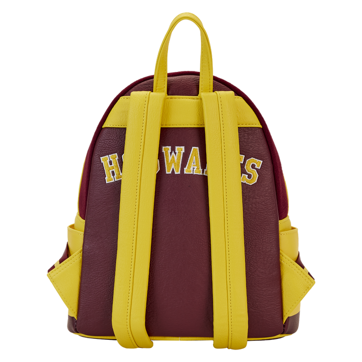 It’s time to show your house pride Hogwarts alumni! The Loungefly Harry Potter Gryffindor Varsity Mini Backpack will keep your necessities secure and represent your wizarding house and school of choice. Made with wool, this backpack replicates the classic varsity jacket style complete with a striped collar (made of vegan leather), chenille patch, Hogwarts Crest, and “Hogwarts” written across the back. This design truly embodies the “boldness” of Gryffindor with gold accents to the maroon base color. It’s a great accessory to complete a casual fandom outfit or dress up for your post-graduation cosplay. Backpack features include sturdy gold-colored metal hardware, adjustable straps, wool, vegan leather (polyurethane), side pockets, applique, chenille patch, metal snap buttons, and embroidered details. Note the coordinating lining.