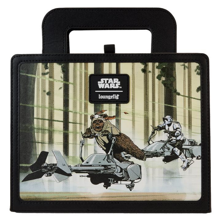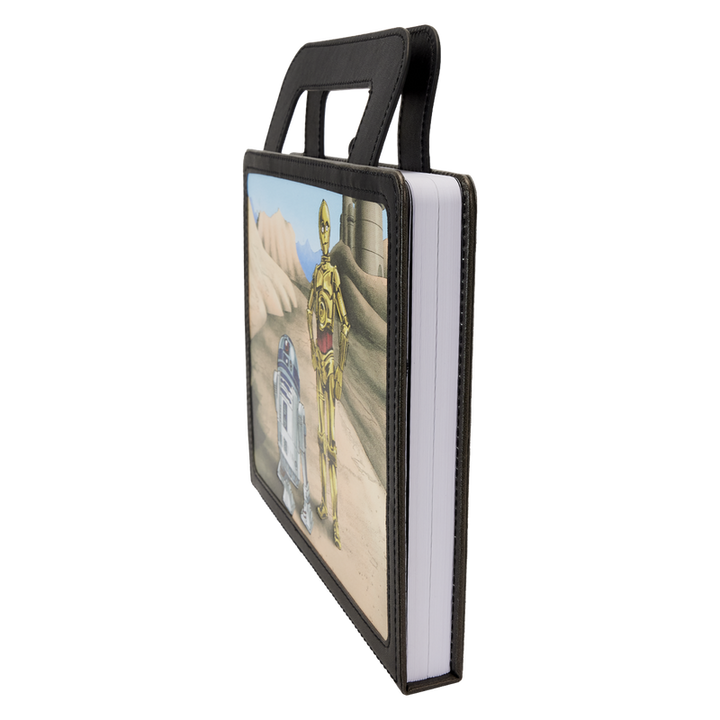 The Loungefly Return of the Jedi Lunchbox Journal is made of vegan leather (polyurethane). Additional features include frosted clear plastic, sticky note, and printed details.