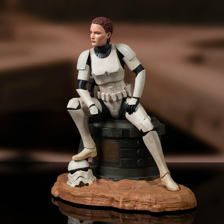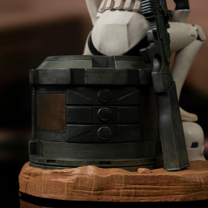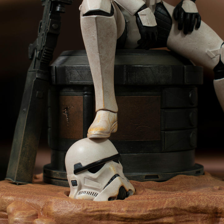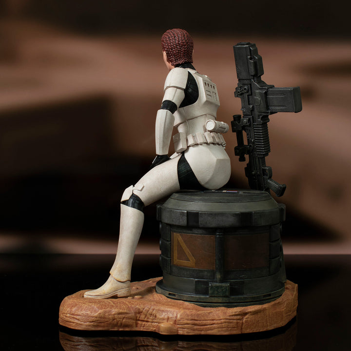 Taken off the streets of Corellia by the Imperial Mission, Jes Gistang was raised for a life in the Stormtrooper Corps, eventually joining the 407th Division's Joker Squad. Assigned the BB-23 Heavy Blaster Cannon, Gistang fell in battle when one of her power packs was pierced by blaster fire but her spirit lives on in this 1/7 scale resin statue. Part of the Premier Collection, this statue depicts her resting after a battle, blaster at her side, and is limited to only 2000 pieces.