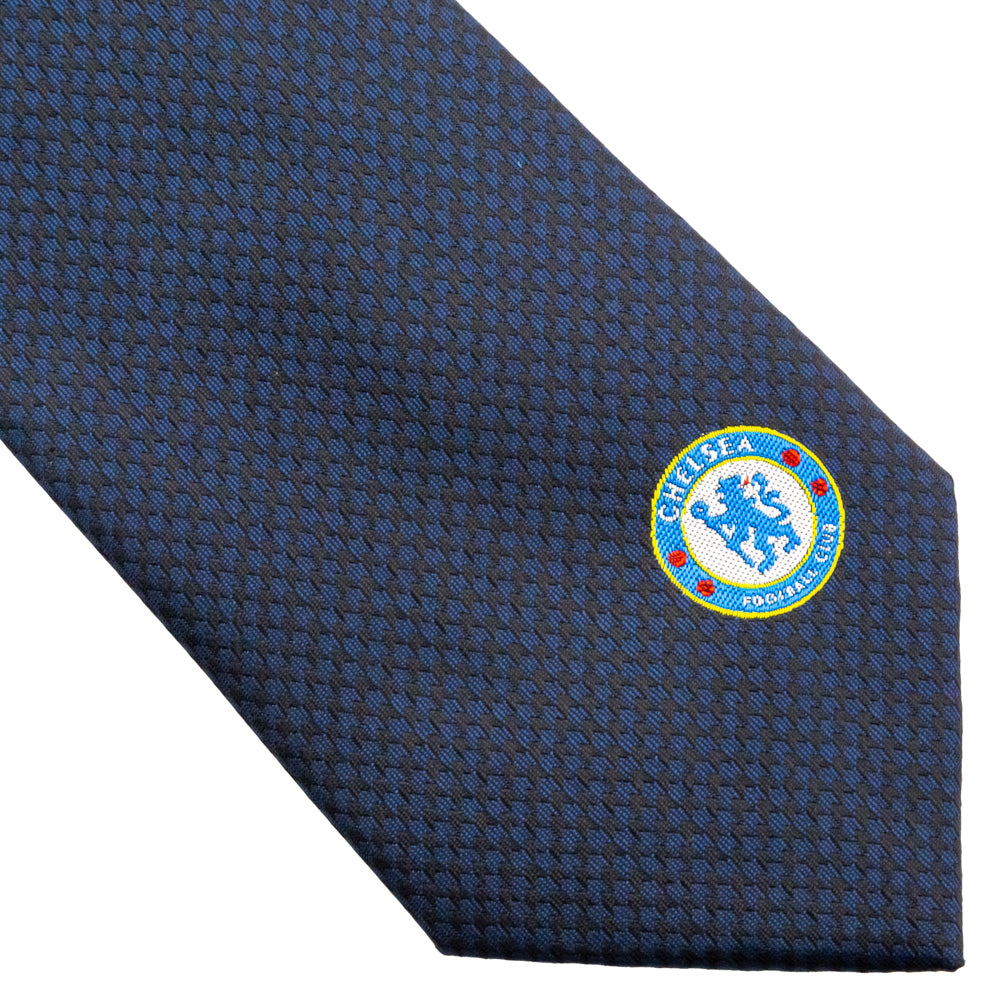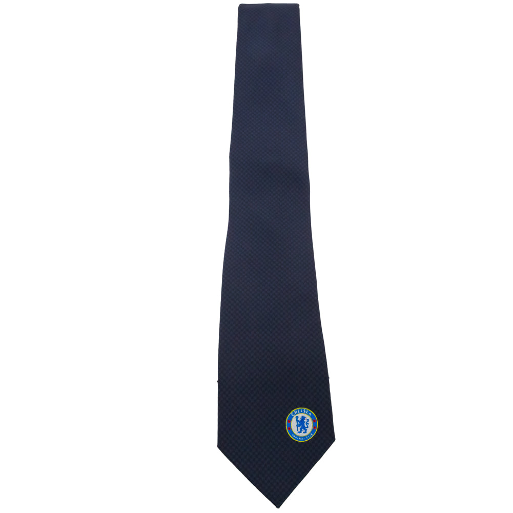 Dark navy and black tie featuring a small Chelsea crest to the bottom