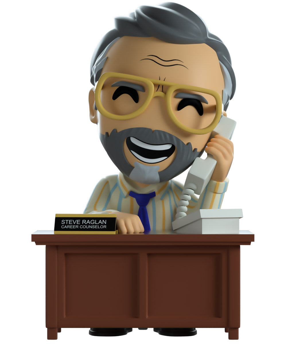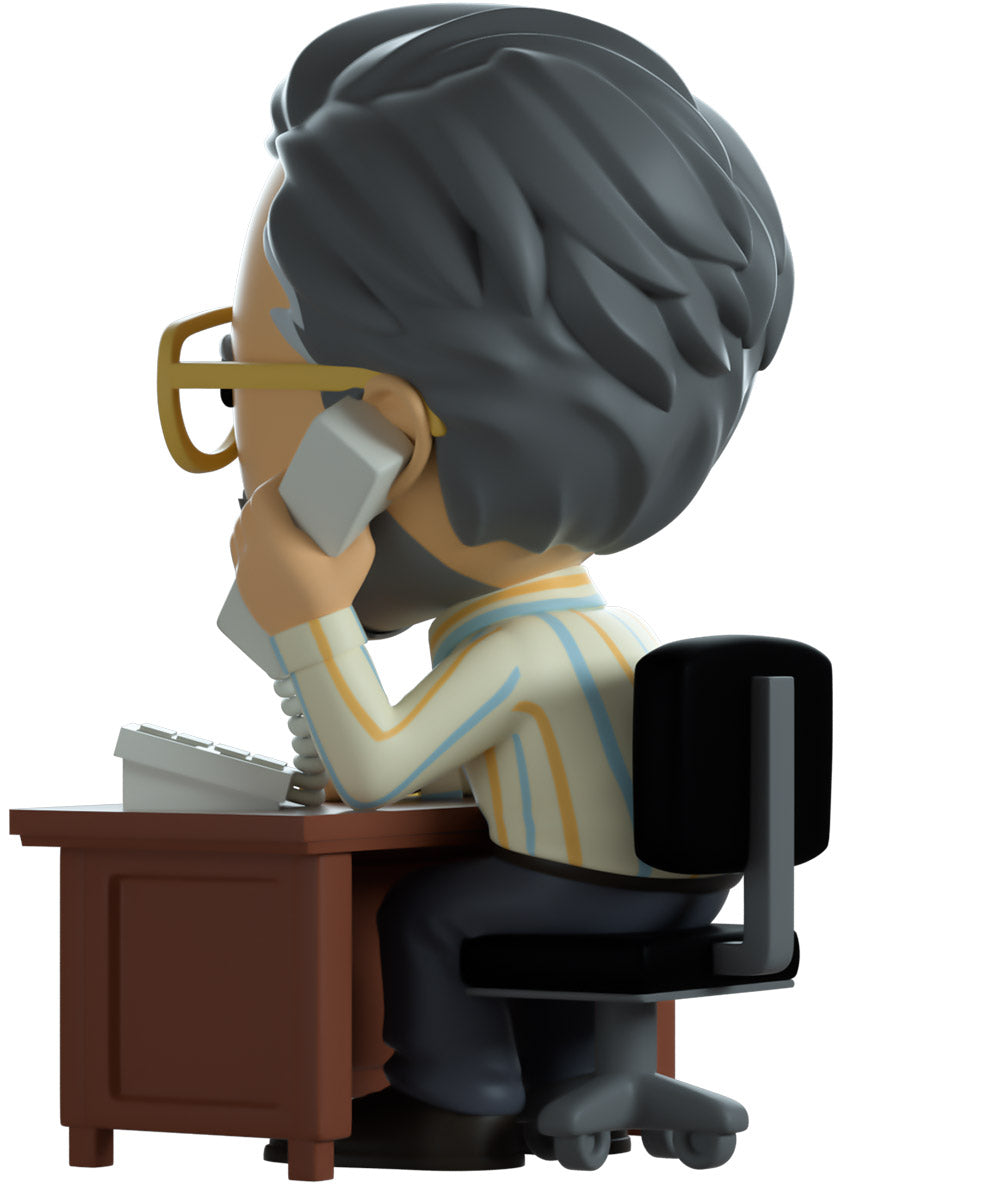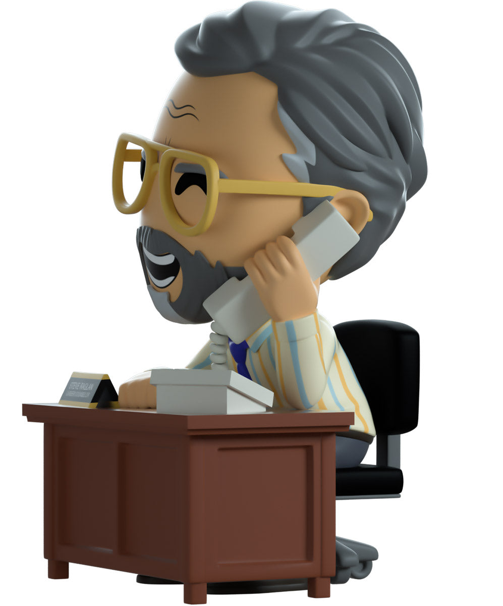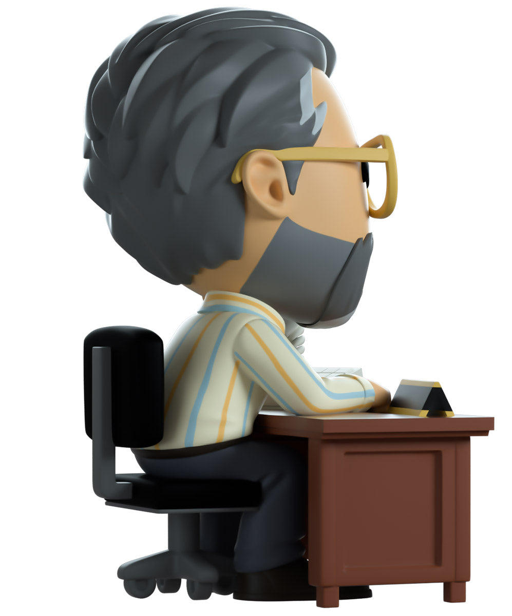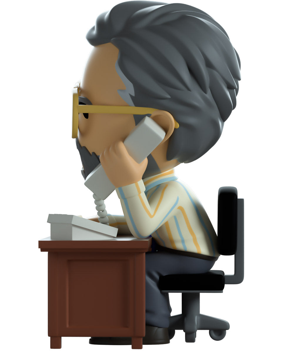 Steve has arrived at Youtooz to give us all some career counseling! Surely he’ll send you on the right path… Sitting on a black and grey rolling chair at 4.3 inches tall and holding a grey phone up to his smiling bearded face, a pair of golden aviator glasses sit under a creased forehead as his grey hair is combed back. Hunching forward to lean on the brown wooden desk in front of him, he wears a blue tie over a striped button up shirt which is tucked into grey pants and black shoes. The exterior of his packaging sees Steve sitting in his dimly lit office. While the interior is filled with dimly lit colored balls which spill onto the protective sleeve as his figure can be seen through the large clear window at the packaging’s front. This collectible ships in a matte, embossed, protective outer sleeve and a custom sized plastic protector for maximum protection during shipping.