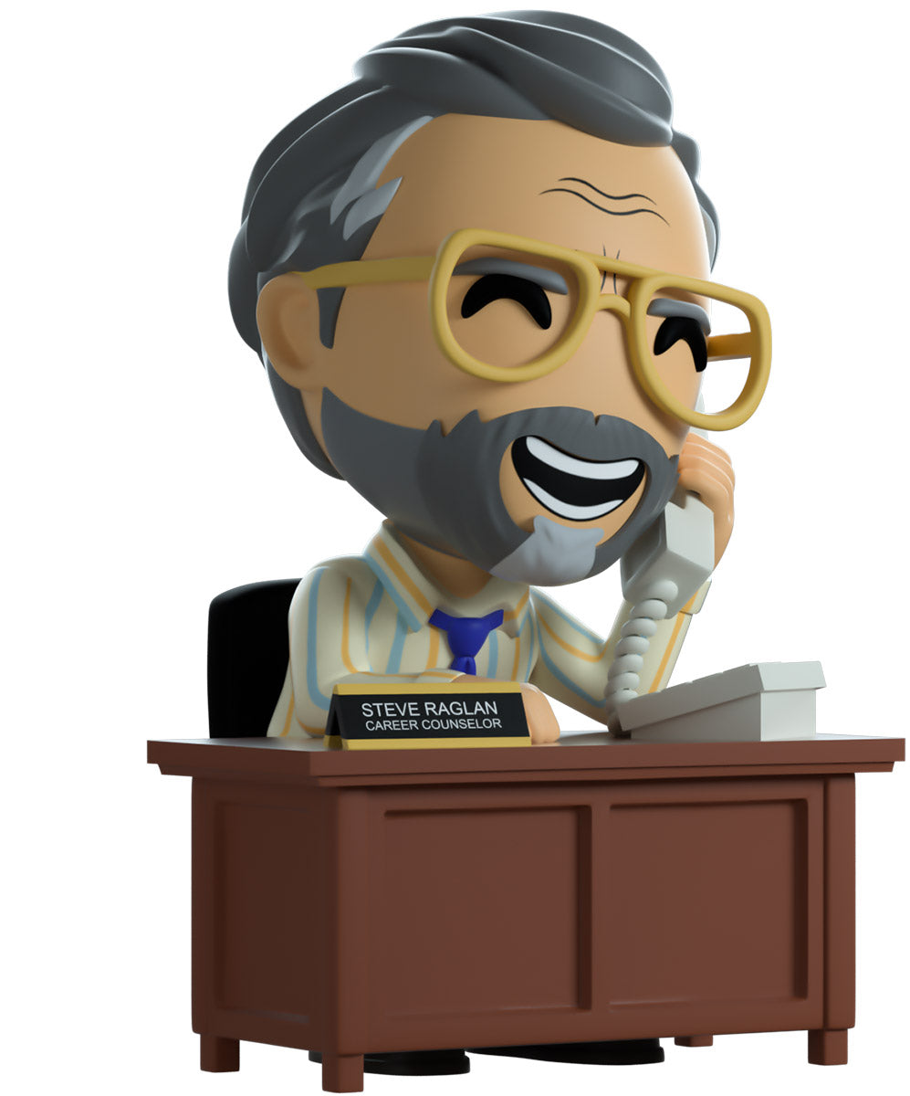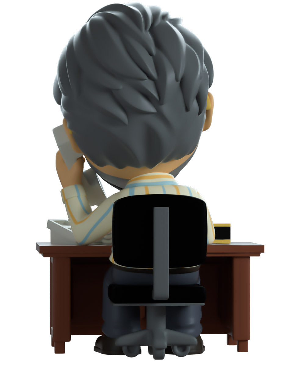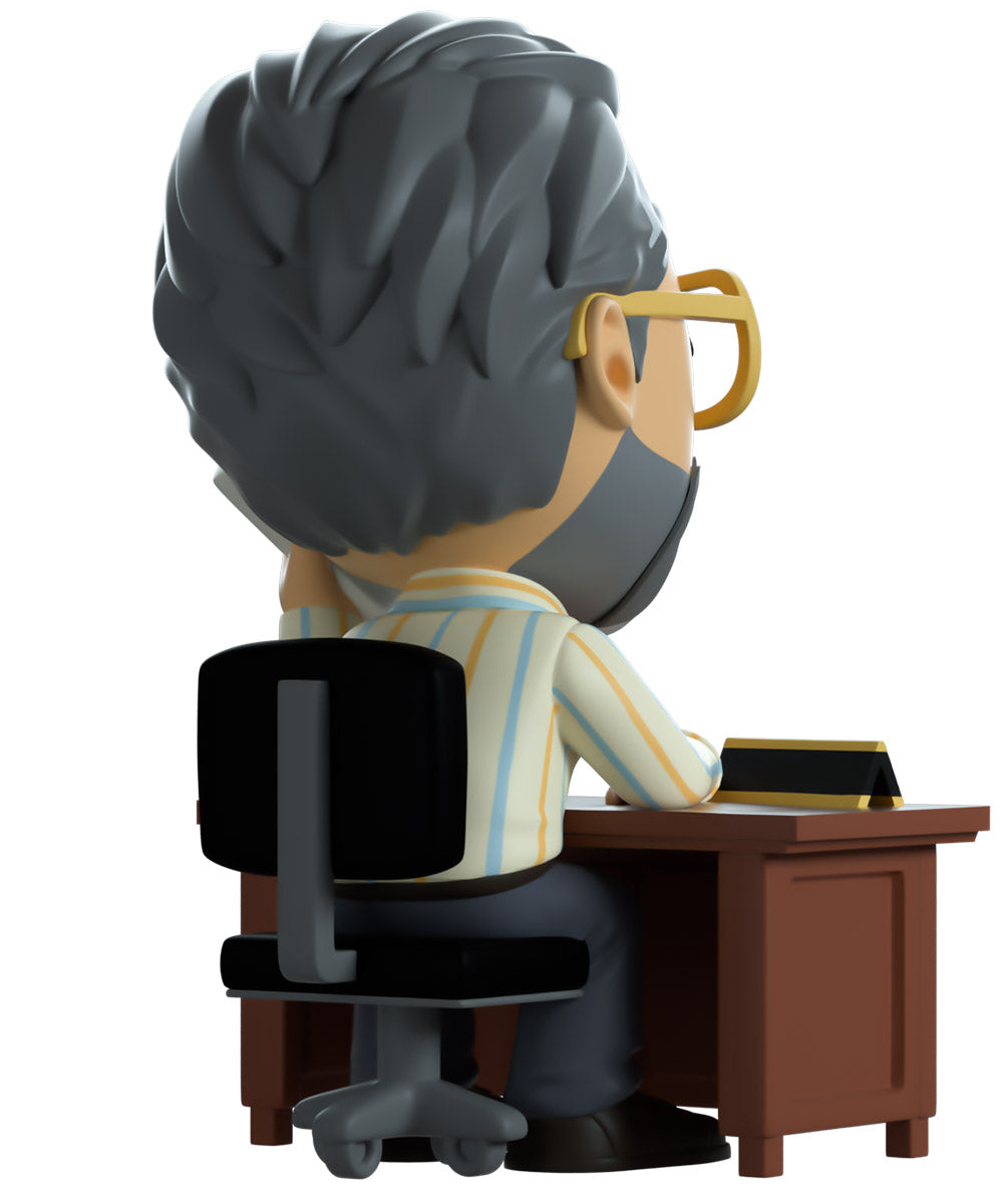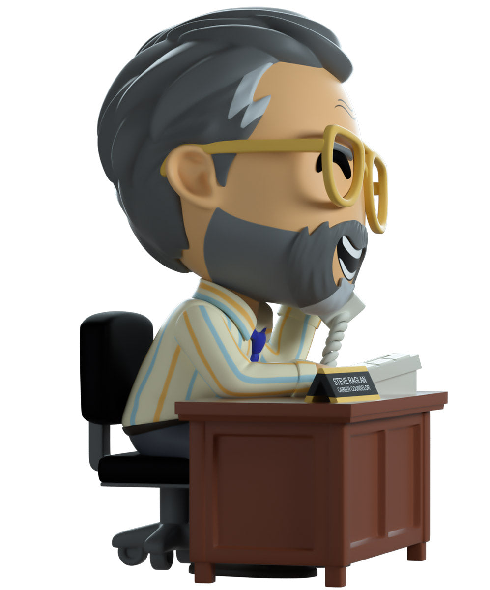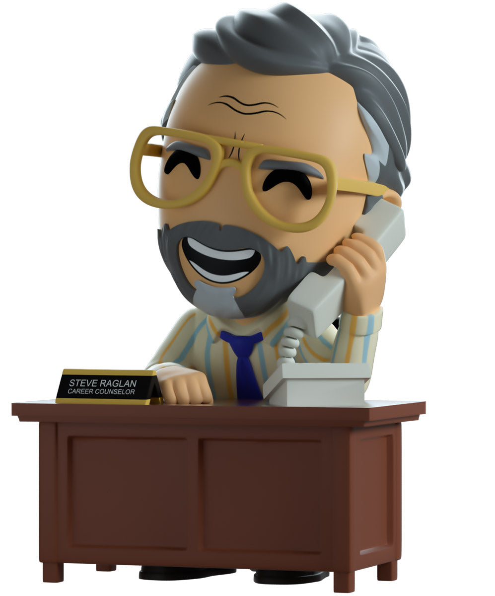 Steve has arrived at Youtooz to give us all some career counseling! Surely he’ll send you on the right path… Sitting on a black and grey rolling chair at 4.3 inches tall and holding a grey phone up to his smiling bearded face, a pair of golden aviator glasses sit under a creased forehead as his grey hair is combed back. Hunching forward to lean on the brown wooden desk in front of him, he wears a blue tie over a striped button up shirt which is tucked into grey pants and black shoes. The exterior of his packaging sees Steve sitting in his dimly lit office. While the interior is filled with dimly lit colored balls which spill onto the protective sleeve as his figure can be seen through the large clear window at the packaging’s front. This collectible ships in a matte, embossed, protective outer sleeve and a custom sized plastic protector for maximum protection during shipping.