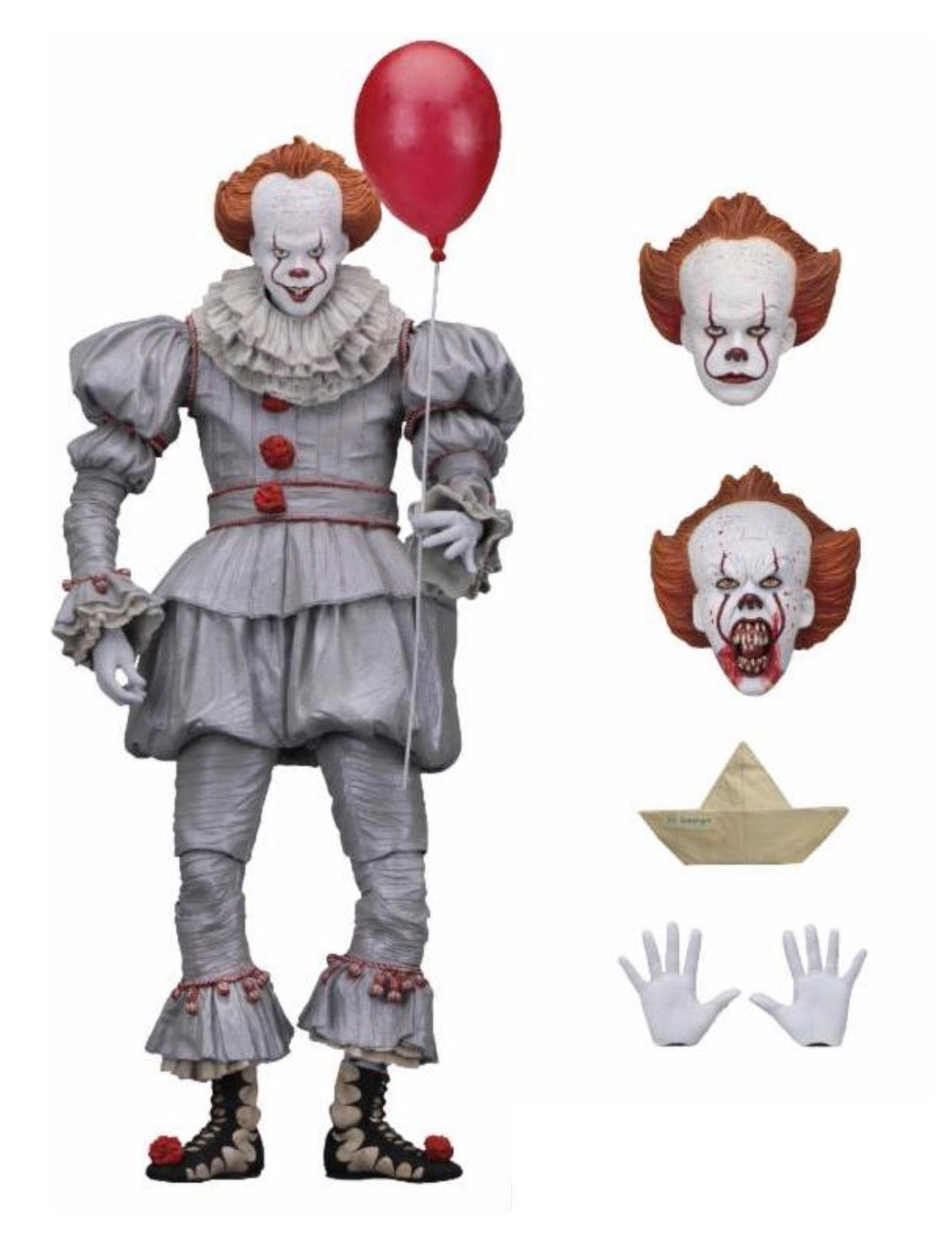 To recreate the most terrifying scenes from the movie, the fully articulated figure features three interchangeable heads, interchangeable hands, red balloon and paper boat.