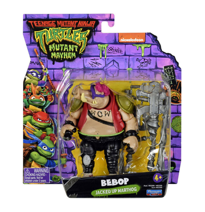 Bebop figure is 4.5-Inches tall and designed to match his movie character. Set includes his blaster and a weapons rack, and comes in a unique Mutant Mayhem package!