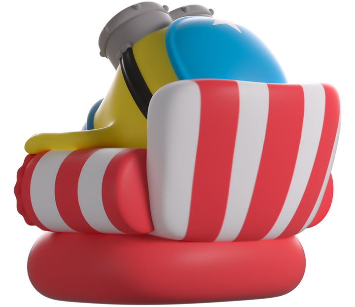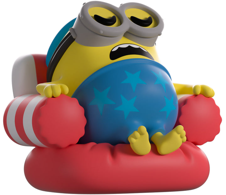 Jerry is here for a good time AND a long time! This adorable minion is happily nestled in a red and white pool floatie at 3 inches tall and is decked out in blue swim trunks with a light star print. Leaning back into the sweet comfort of his inflatable chair and sleeping soundly with his mouth open under iconic minion goggles, on top of his head is a blue swim cap to complete this swim look! The exterior of their packaging is a deep blue, with a diagonal pattern of AVL logos streaking across it which continue onto the interior. The protective sleeve mimics the same deep blue as their figures can be seen through the large clear window at its front. This collectible was designed in collaboration with community member @therealracckun and ships in a matte, embossed, protective outer sleeve and a custom-sized plastic protector for maximum protection during shipping.