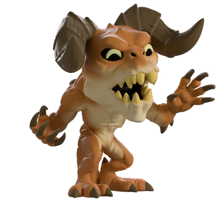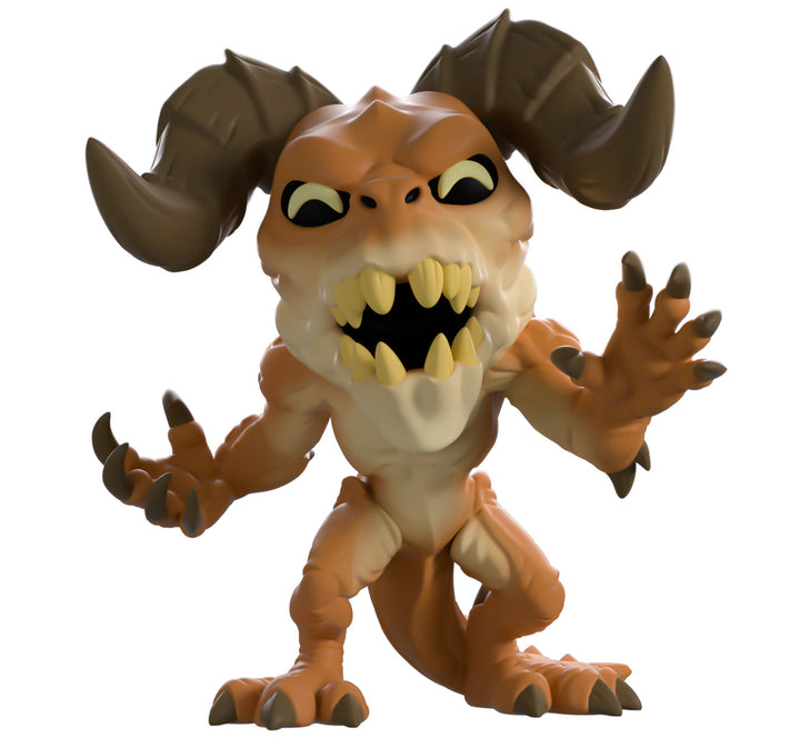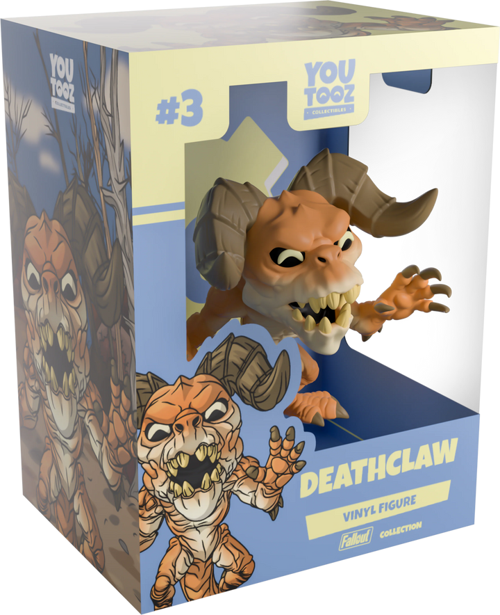 The most fearsome beast of the wasteland has made their way into Youtooz to make it their new territory! At 4 inches tall and reaching their clawed hands forward as they let loose an absolutely terrifying roar from their rotten brown toothed mouth, their thick brows curve angrily over dark eyes as long segmented horns twist forward from the top of their head. With scaled brown flesh that wrinkles at their joints and a light undercarriage, a series of thick spines poke out from their back and arms as a long tail falls behind them. The exterior of their packaging sees the Deathclaw tramping through a desolate wasteland. The interior is then a pale blue with the ‘Vault 101’ logo on its back while the protective sleeve is a desolate wasteland covered in Vault Boy’s as the figure can be seen through the large clear window at the packaging’s front. This collectible ships in a matte, embossed, protective outer sleeve and a custom-sized plastic protector for maximum protection during shipping.
