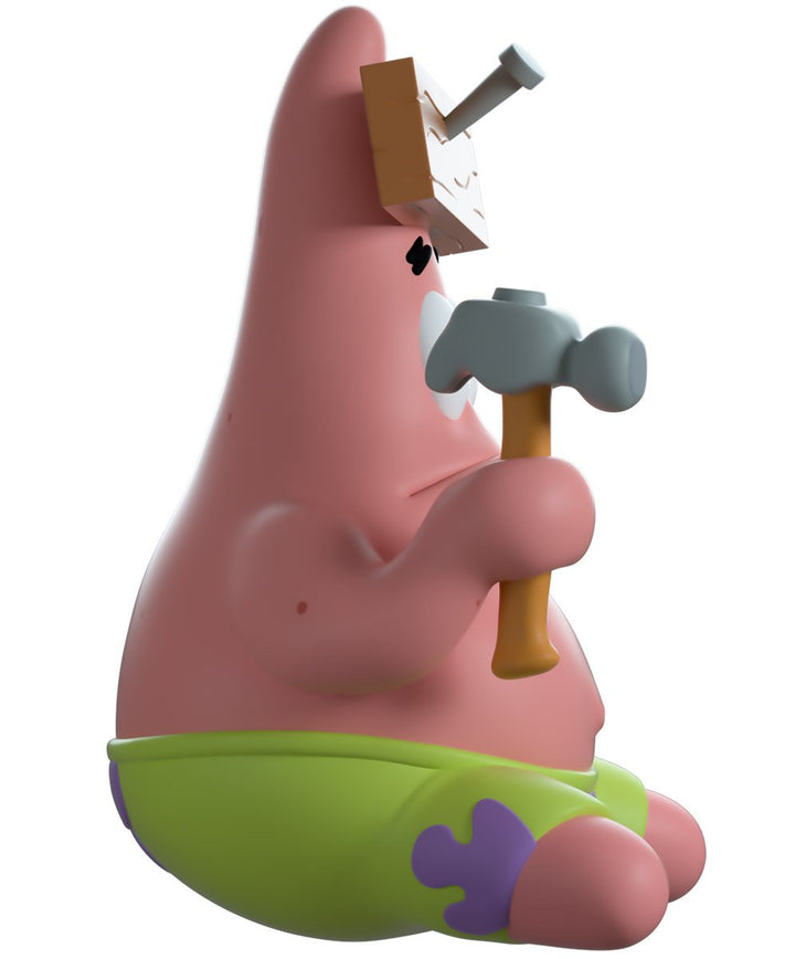 Patrick has returned to Youtooz to make some repairs! Sitting at 4 inches tall with a blank look in his eyes and a slight frown crossing his wide mouth, a brown wooden plank has been driven to his forehead with a singular nail. H-how did it get there?! Wearing his usual green and purple shorts, his legs stick out to the front as he holds a claw tooth hammer upwards in his right hand. The exterior of his packaging sees Patrick surrounded by tools and wood as he attempts to finish his building project. While the interior is an ocean blue gradient collaged with illustrations of SpongeBob. The protective sleeve is printed with SpongeBob’s bright yellow triangular pattern as his figure can be seen through the large clear window at its front. This collectible ships in a matte, embossed, protective outer sleeve and a custom sized plastic protector for maximum protection during shipping.