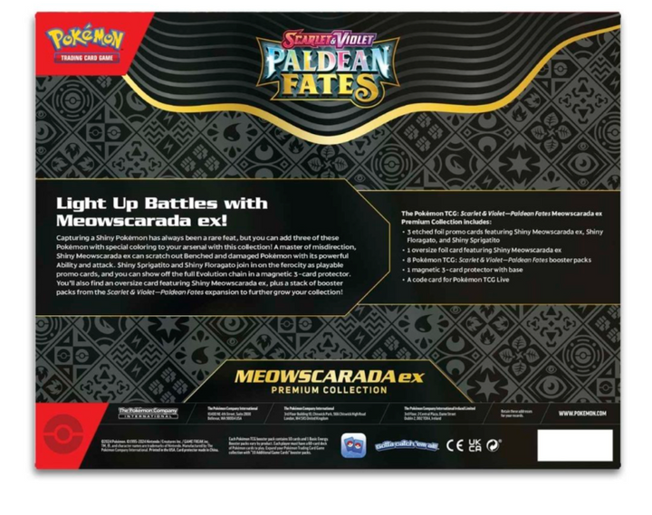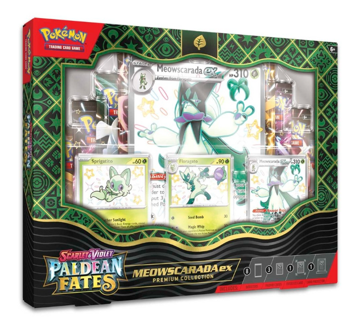The Pokémon TCG: Scarlet & Violet—Paldean Fates Meowscarada ex Premium Collection includes: