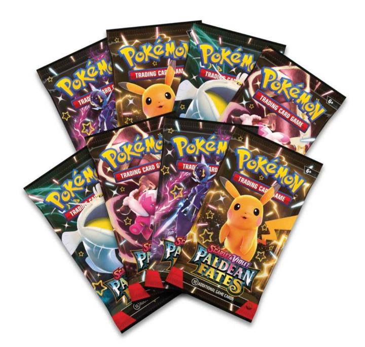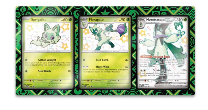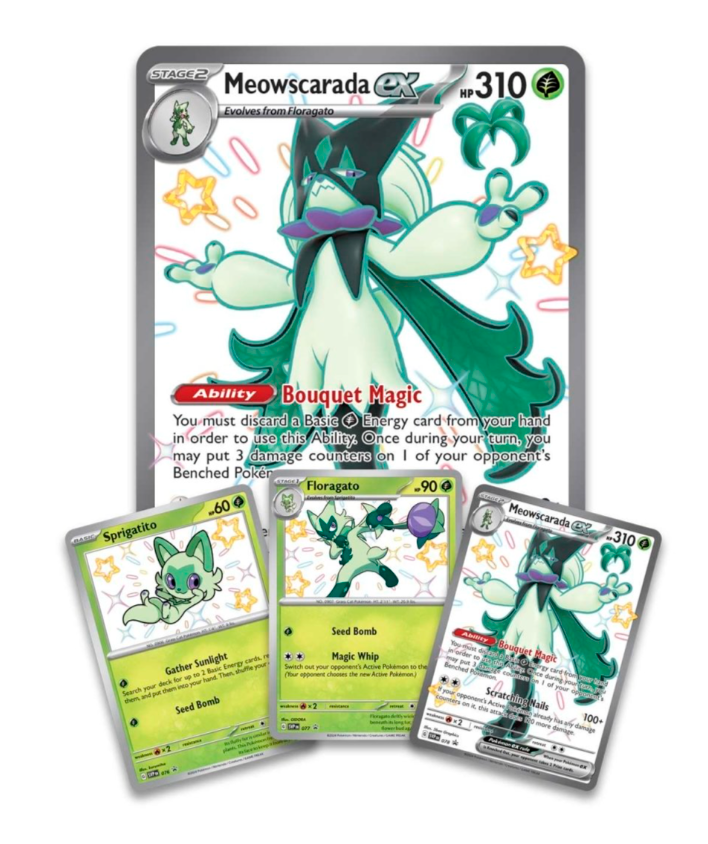 Capturing a Shiny Pokémon has always been a rare feat, but you can add three of these Pokémon with special coloring to your arsenal with this collection! A master of misdirection, Shiny Meowscarada ex can scratch out Benched and damaged Pokémon with its powerful Ability and attack. Shiny Sprigatito and Shiny Floragato join in on the ferocity as playable promo cards, and you can show off the full Evolution chain in a magnetic 3-card protector. You’ll also find an oversize card featuring Shiny Meowscarada ex, plus a stack of booster packs from the Scarlet & Violet—Paldean Fates expansion to further grow your collection!