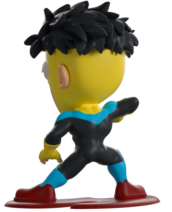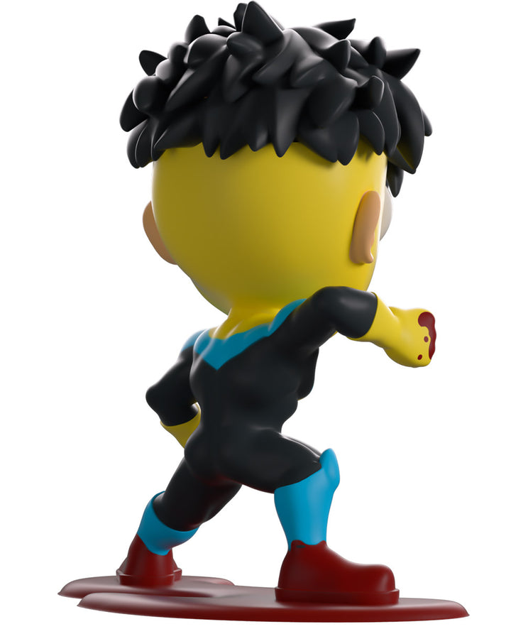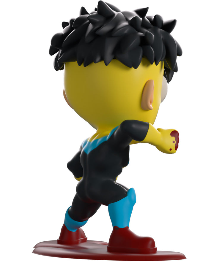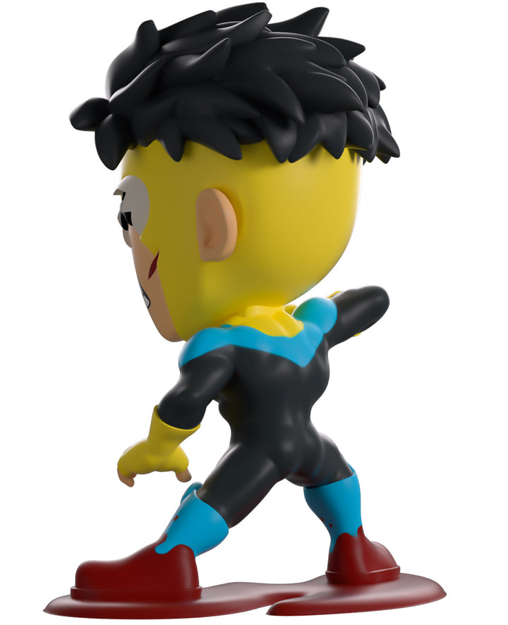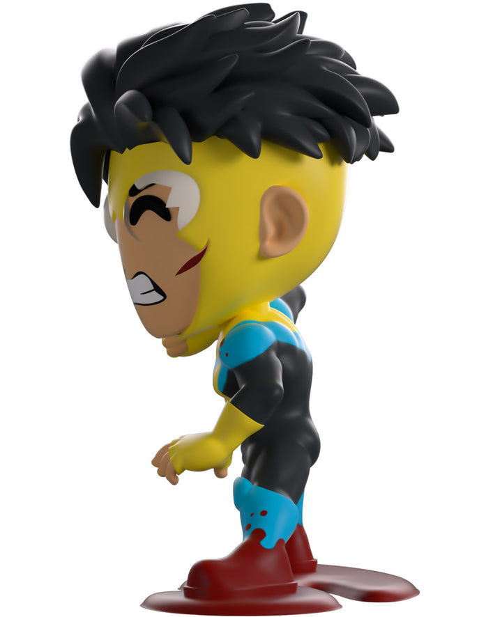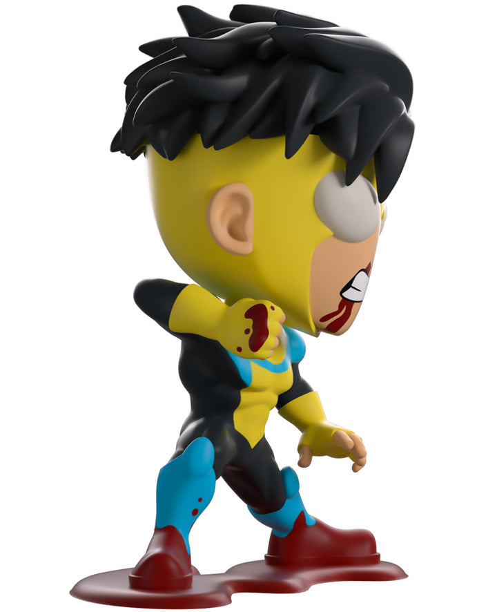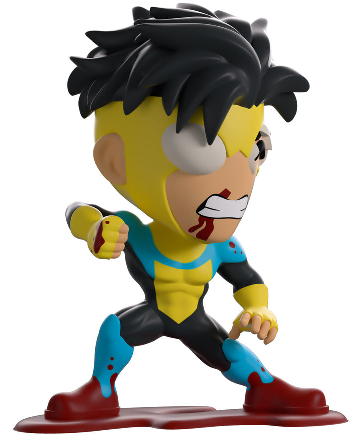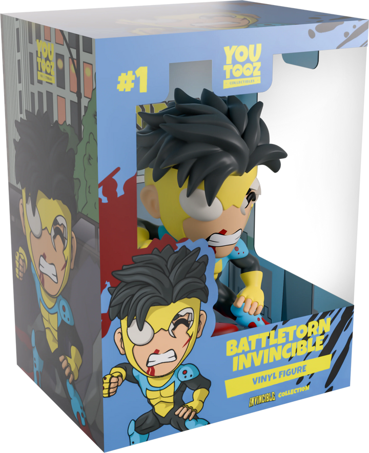 Invincible has returned to Youtooz as our last line of defence! Standing at 4.3 inches tall in a puddle of vibrant red blood which covers his feet and he is posed with a fist raised as his other hand reaches forward, his teeth grit in determination through the open face of his suit as his left eye is shattered. With blood streaming from his nostril with his dark hair swept back in thick chunks. Invincible wears a skin-tight grey, yellow and blue suit, fingerless gloves, and knee-high boots. The exterior of his packaging sees him standing in a crater that was made by him getting violently slammed into the ground. The interior shows a pristine city skyline under a bright blue sky which stretches onto the protective sleeve as his figures can be seen through the large clear window at its front. This collectible ships in a matte, embossed, protective outer sleeve and a custom-sized plastic protector for maximum protection during shipping.