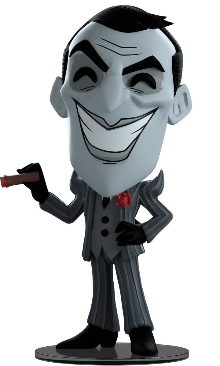 The Amazing Maxwell's next act is about to begin, as he becomes a Youtooz figure! The king of nightmares stands at 4.8 inches tall. He stands with a confidence only royalty can have, dressed to the 9's in a sharp-shouldered pinstripe grey 3-piece suit. His right-hand holds a loft a lit cigar, while a rid rose sits above his heart. He is complete with a huge nefarious grin across his face. The windowed display box has been illustrated in with a sepia-toned forests cape, with Maxwell in the middle of a clearing smoking his cigar with a giant grin. The interior of the box has been designed with a sharp angled spiral overtop of a grey backdrop. The protective sleeve continues this design with black and grey tones. This collectible was designed in collaboration with @therealracckun, ships in a matte, embossed, protective outer sleeve and a custom-sized plastic protector for maximum protection during shipping.