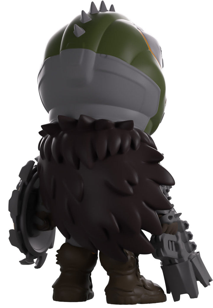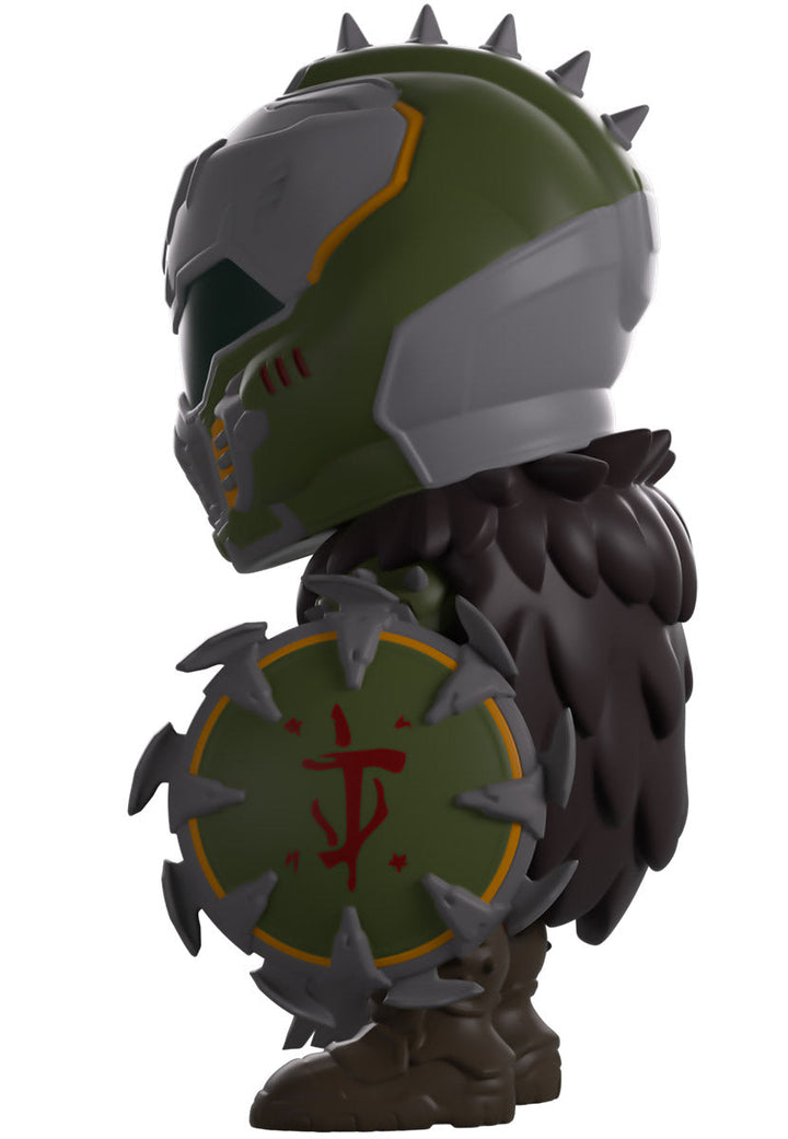The threat of hell has returned to Youtooz and the Slayer has come along to set things right! Standing at 5.1 inches tall with a serrated green shield gripped in his left hand at the ready to tear a demon to shreds, while the right holds a grey gun that he’ll use to finish the job, they stare forward through a dirty green helmet that has spikes running along the top. With a feathered black cape flowing from his back and a chest plate covering his torso, chain links hang from under a brown waistcloth as sturdy boots cover his legs. The exterior of their packaging sees the Slayer standing in front of flowing lava, while the interior is pitch black with the ‘DOOM The Dark Ages’ logo printed on the back. The protective sleeve is covered in demon carcasses as dragons fly through the sky, and his figure can be seen through the large clear window at the packaging’s front. This collectible ships in a matte, embossed, protective outer sleeve and a custom-sized plastic protector for maximum protection during shipping.