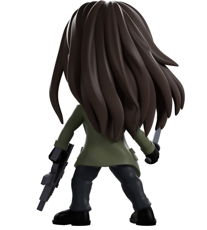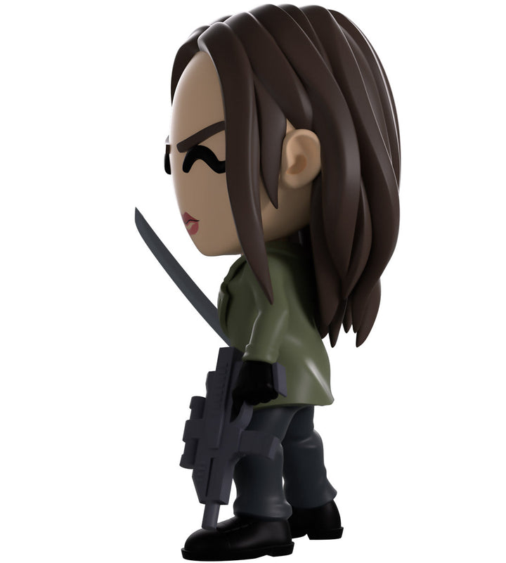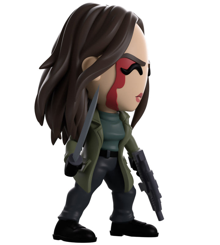 The Ballerina’s quest for vengeance has led her to Youtooz in search of her next victim! Standing at 4.3 inches tall with a katana held in her right hand and a machine gun in the left, long flowing brown hair fans around her blood-smeared face as she stares onward. With an army green coat flicking to the side, she wears a dark sweater with a thick collar and grey pants, as black gloves match her thick boots. The exterior of her packaging looks down at a blood-covered ballerina music box, while the interior is covered in a purple haze. The black protective sleeve then has a glowing blue line running across its centre as her figure can be seen through the large clear window at the packaging’s front. This collectible ships in a matte, embossed, protective outer sleeve and a custom-sized plastic protector for maximum protection during shipping.