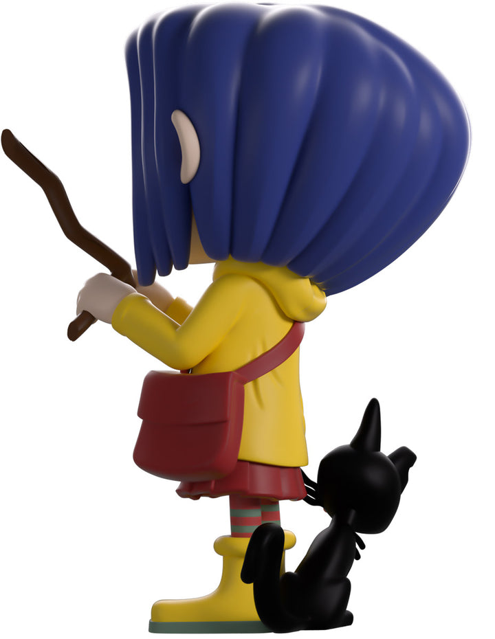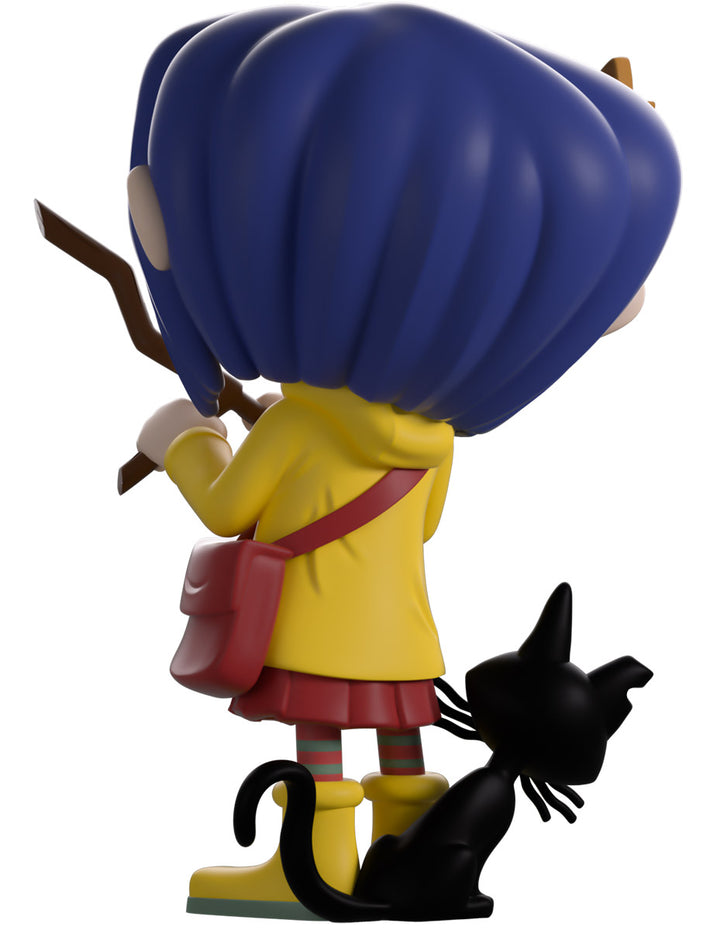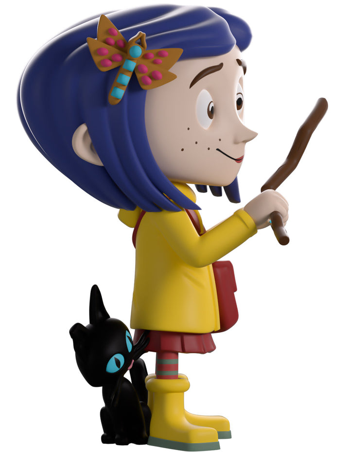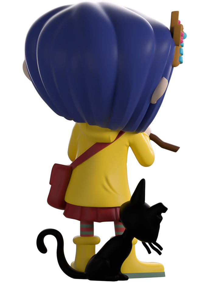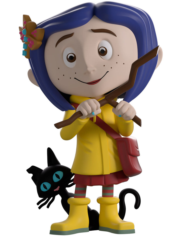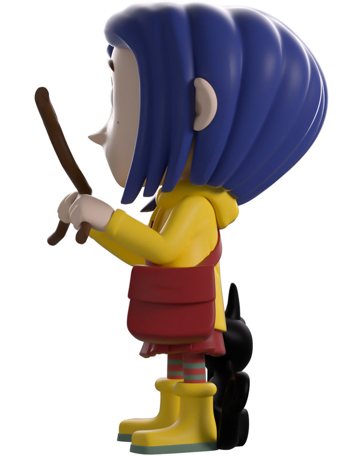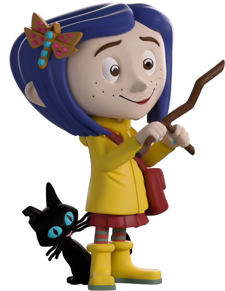 Coraline has ventured into the Other world of Youtooz for her vinyl debut! Standing at 4.5 inches tall and holding a wooden dowsing rod to her front in hopes of finding water, an endearing smile crosses her freckled face as shoulder-length blue hair parts in the middle with a dragonfly clip sitting on the right side. Always dressed ready for an adventure, she wears a bright yellow raincoat over a pink dress along with matching gumboots and striped socks as an inquisitive black cat sticks its head around from her side. The exterior of her packaging sees Coraline and the cat going for a stroke in front of a full moon, while the blue interior is covered in white stars. The protective sleeve is then pitch black with white stitching running around it as her figure can be seen through the large clear window at the packaging’s front. This collectible ships in a matte, embossed, protective outer sleeve and a custom-sized plastic protector for maximum protection during shipping.