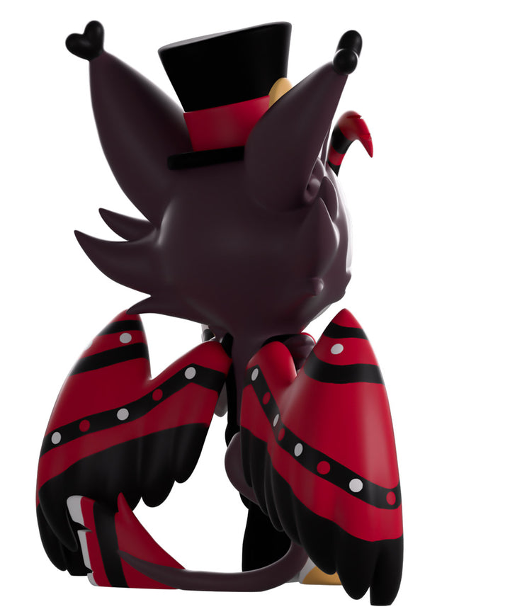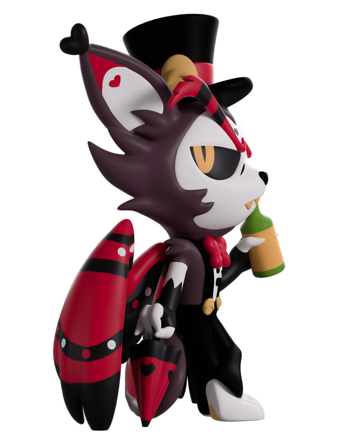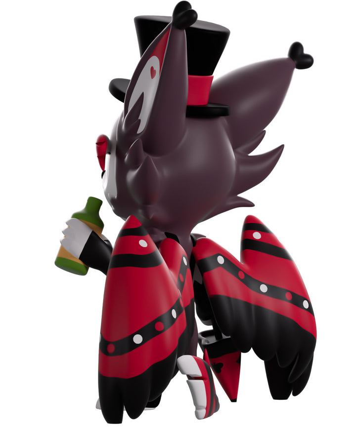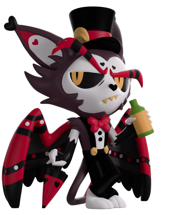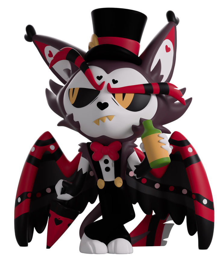 Do you need a drinking buddy? Well, Husk has landed at Youtooz to be the best bud imaginable as you drink your sorrows away! Standing at 4.6 inches tall as he holds a bottle in his left hand and shoots a disgruntled look to the side with pale yellow eyes under long striped eyebrows, his pointed ears end in little black hearts and sit to either side of a black top hat. With his red, black and white wings stretched out wide as he leans on a folded umbrella, he wears a red bowtie and suspenders as a long fanned tail wraps around his back. The exterior of his packaging is covered with ornate golden wall trim over a deep red background, while the interior sees him standing at his bar taking a huge swig from a bottle. The protective sleeve then shows off the city’s silhouette with a deep red light shining from the buildings as his figure can be seen through the large clear window at the packaging’s front. This collectible ships in a matte, embossed, protective outer sleeve and a custom-sized plastic protector for maximum protection during shipping.